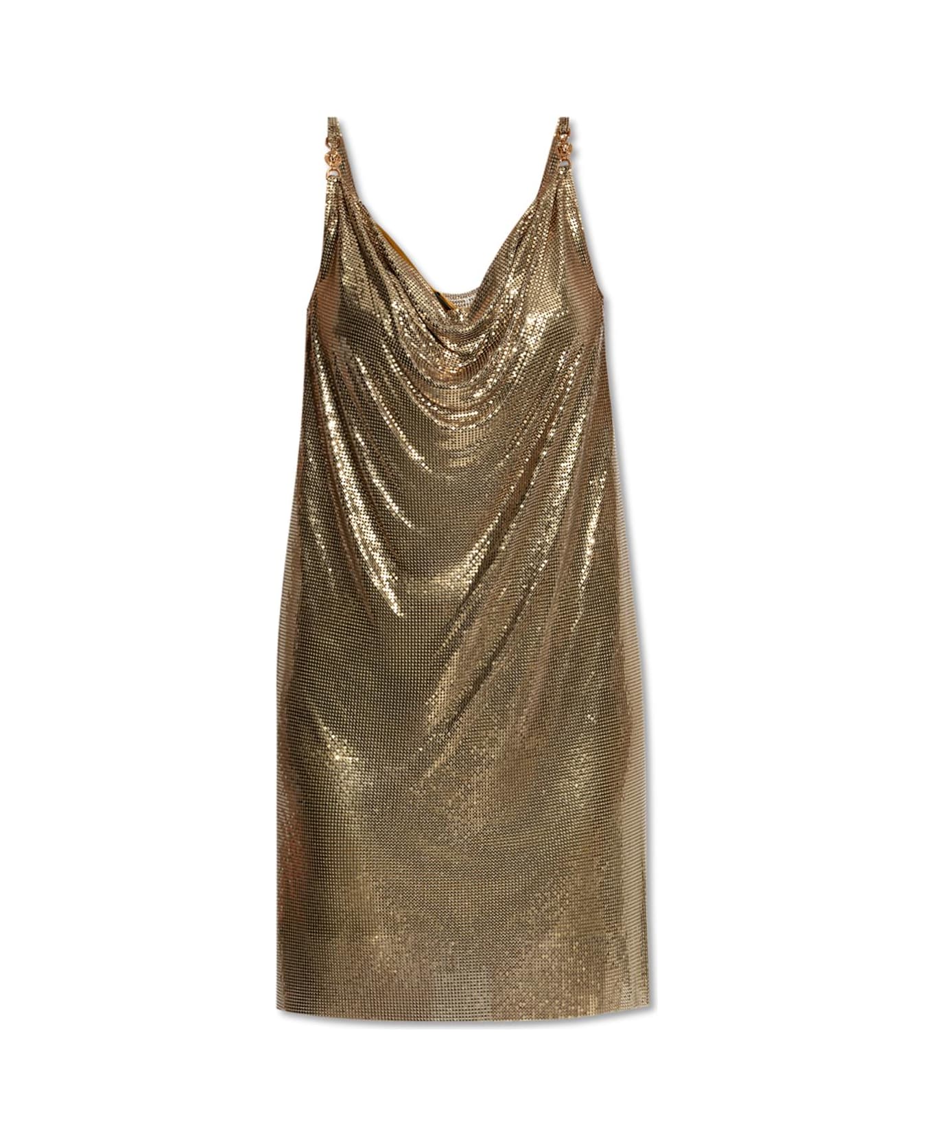Exuding unmistakable sophistication, this Sequin Mesh Mini Slip Dress by Versace embodies a distinct allure. Its effortlessly straight silhouette flows just above the knee, allowing for graceful movement and versatile styling. The draped cowl neckline, elegantly cascading both front and back, highlights the artistry of its construction. Delicate straps are adorned with a refined metallic connector embellished with the designer's emblem, reflecting Versace's commitment to elevated detail. Meticulously crafted from luminous sequin mesh, this piece captivates with its mirror-like brilliance. Beneath, a sumptuous lining of acetate and silk envelops you in lavish comfort. The golden sequin pattern, arranged in a subtle mesh, evokes glamour without overt branding save for the discreet, iconic touch at the strap. Why choose this product? Exquisite hand feel and radiant, light-reflecting finish Signature Versace detailing with a sophisticated metallic accent Timeless yet boldly modern silhouette Luxurious silk-blend lining for ultimate comfort An iconic design that celebrates individuality and refined style