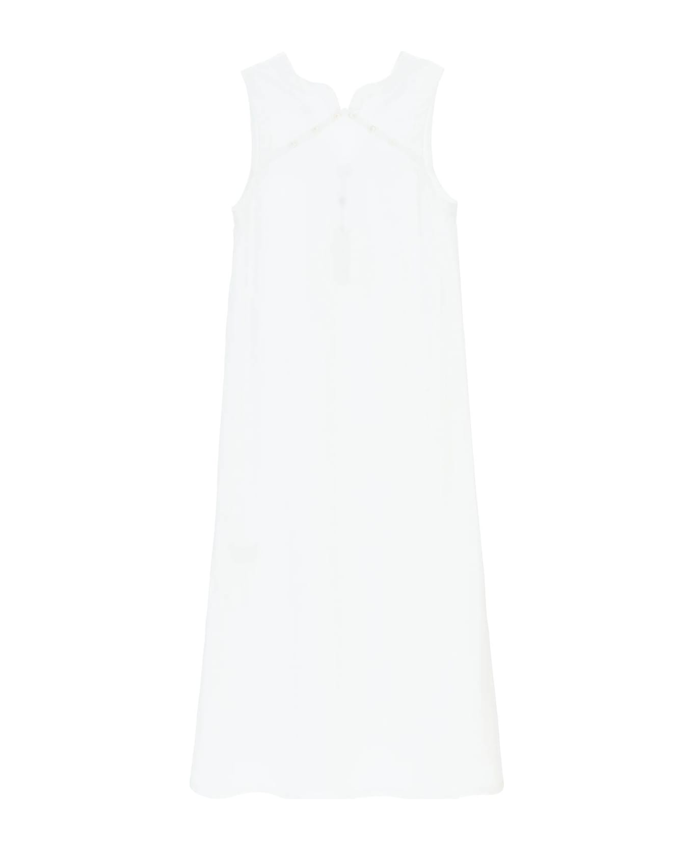 Saks Potts long trapeze dress in pure cotton popline, showcasing a streamlined design with shaped neckline and buttoning, and a rear V-neckline. The model is 177 cm tall and wears a size S.