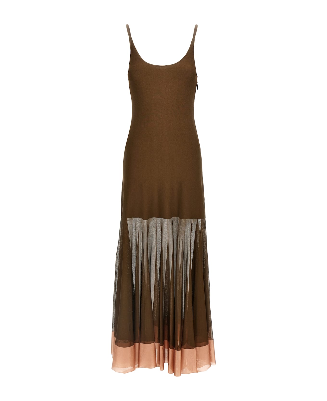 Long dress in matt viscose yarn worked in a mix of color block effect stitches, model with semi-transparent flared skirt and contrasting flounce in shiny viscose yarn on the hem, sleeveless with thin straps, wide round neckline front and back, side zip closure.