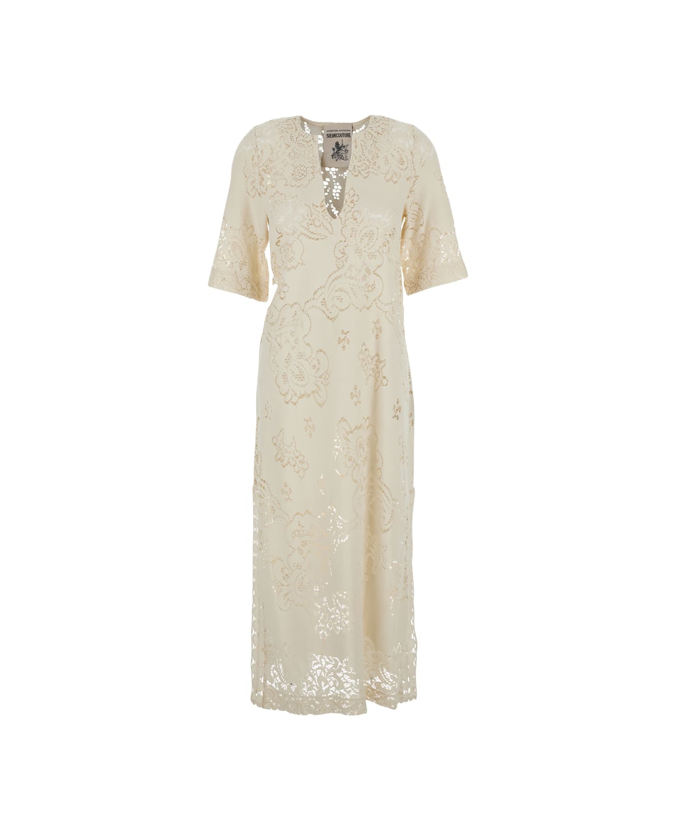 White Long Dress With Deep V-neck And Lace Details In Cotton Blend Woman