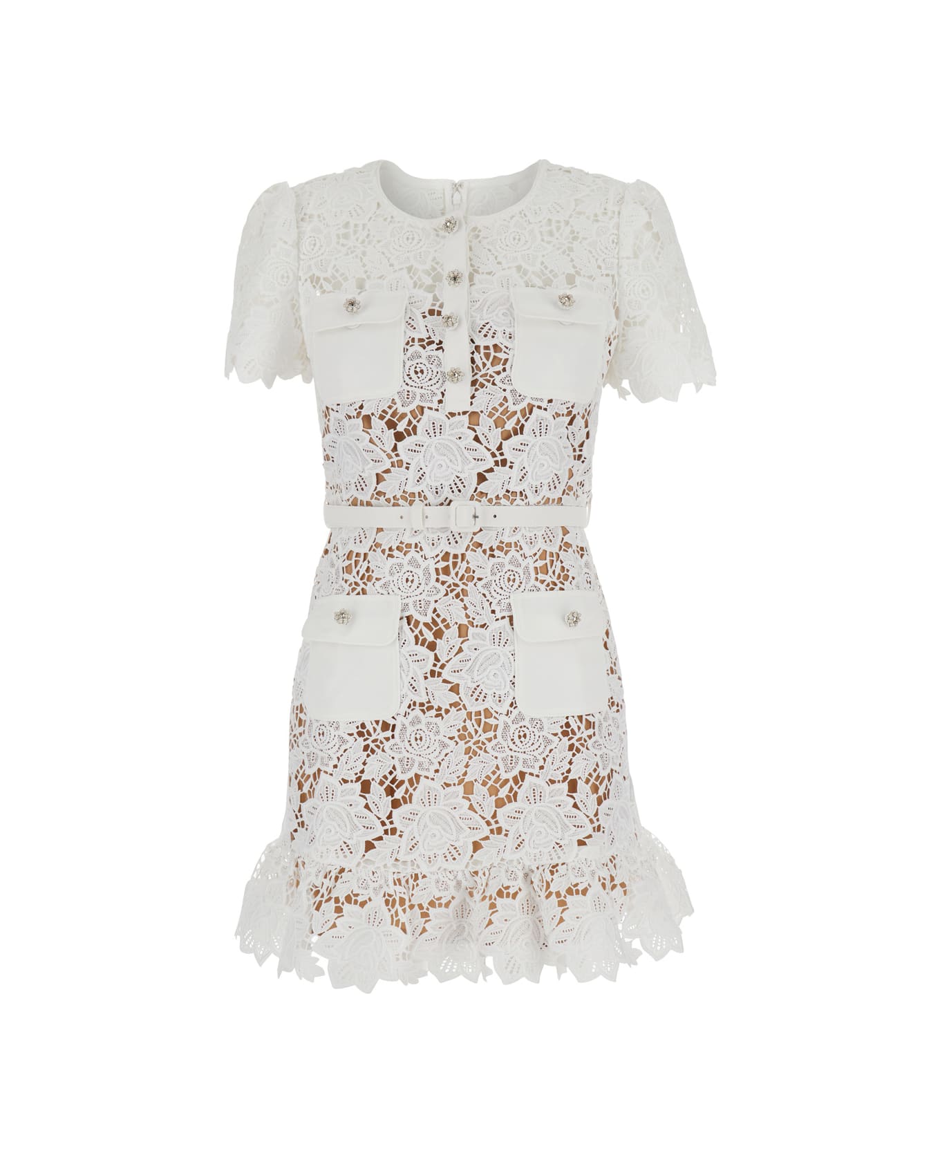 Mini dress White Crewneck Short sleeves Front jewel button embellishments Crystal buttons Four front patch flap pockets with button Removable belt Rear concealed zip closure Flared hem All-over floral lace embroidery Tech fabric Regular fit