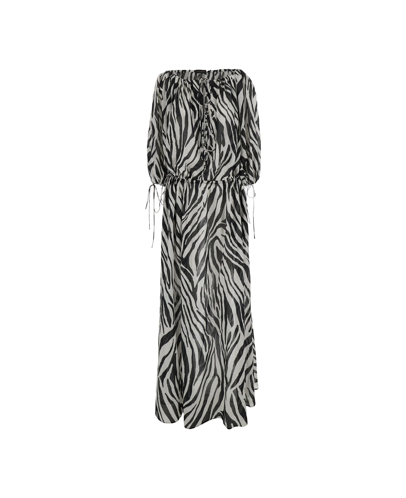 Long dress Black and white Boat neckline Long drawstring balloon sleeves Front tie detail Straight hem All-over zebra print Cotton Relaxed fit