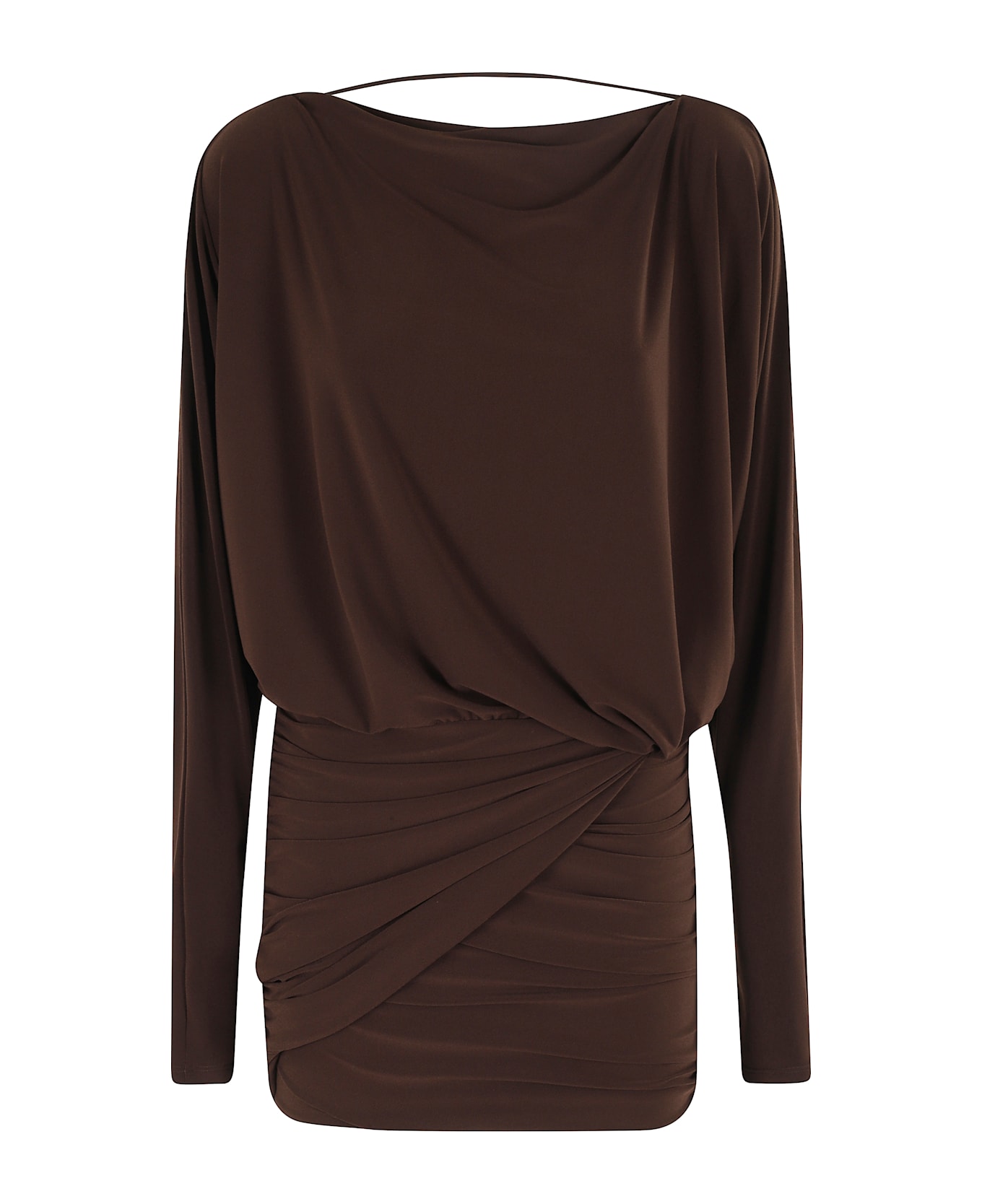 Wisteria Mini Dress - The Andamane - Brown color - Jersey fabric - Straight neckline - Long sleeve - Wide neckline at back - Mini skirt with drape