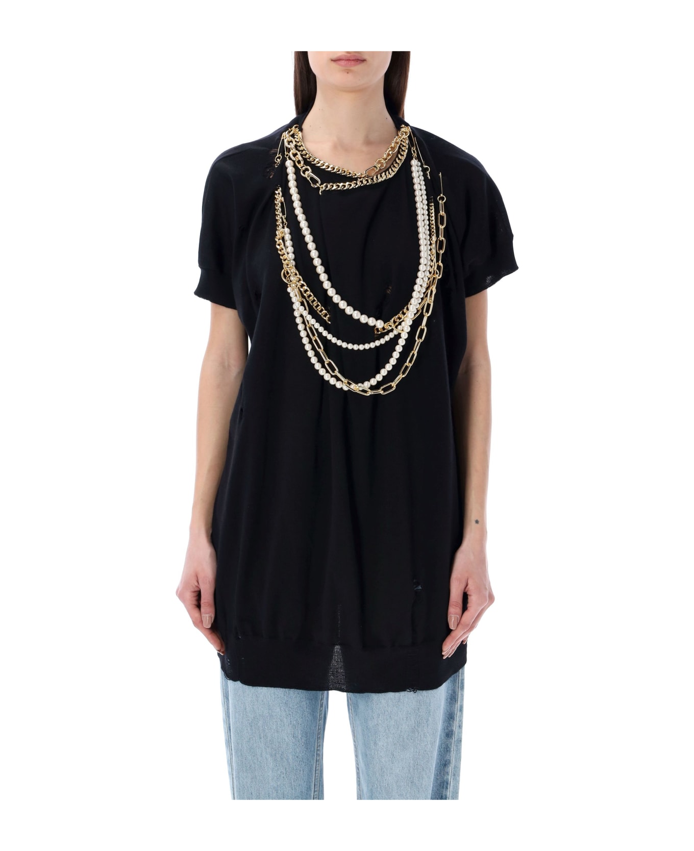 Wool Top With Chains By Junya Watanabe. Featuring: Jewel Neckline Ripped Details Short Sleeves Loose Fit Removable Chains, Pearl Necklaces And Pins Ribbed Edges Model Is 1,72 M Tall And She Is Wearing Size S