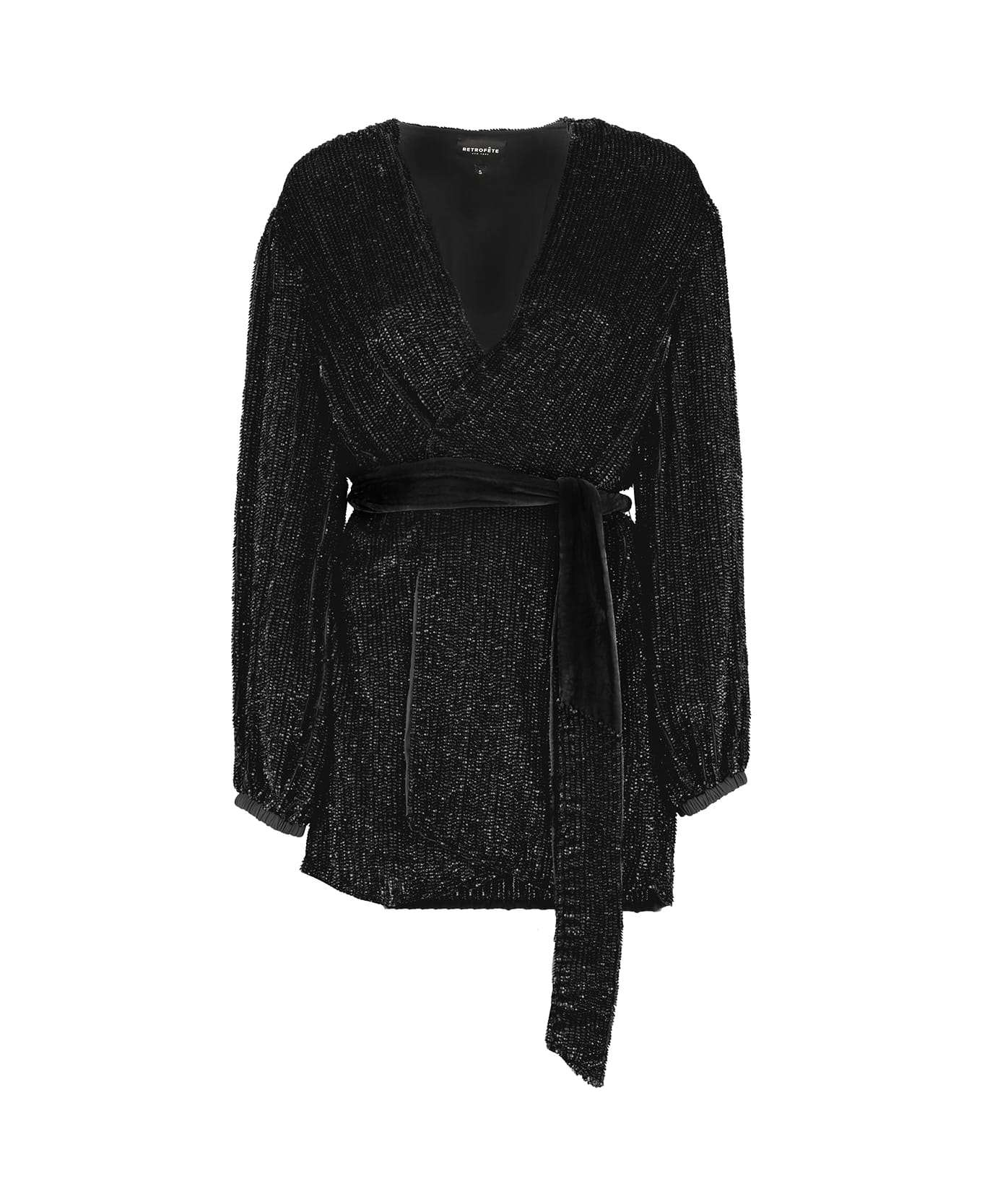 - Black Retrofete viscose dress for woman - V-neck - Long sleeves with elastic at hem - Front double-breasted closure - Matching belt included - All-over sequins