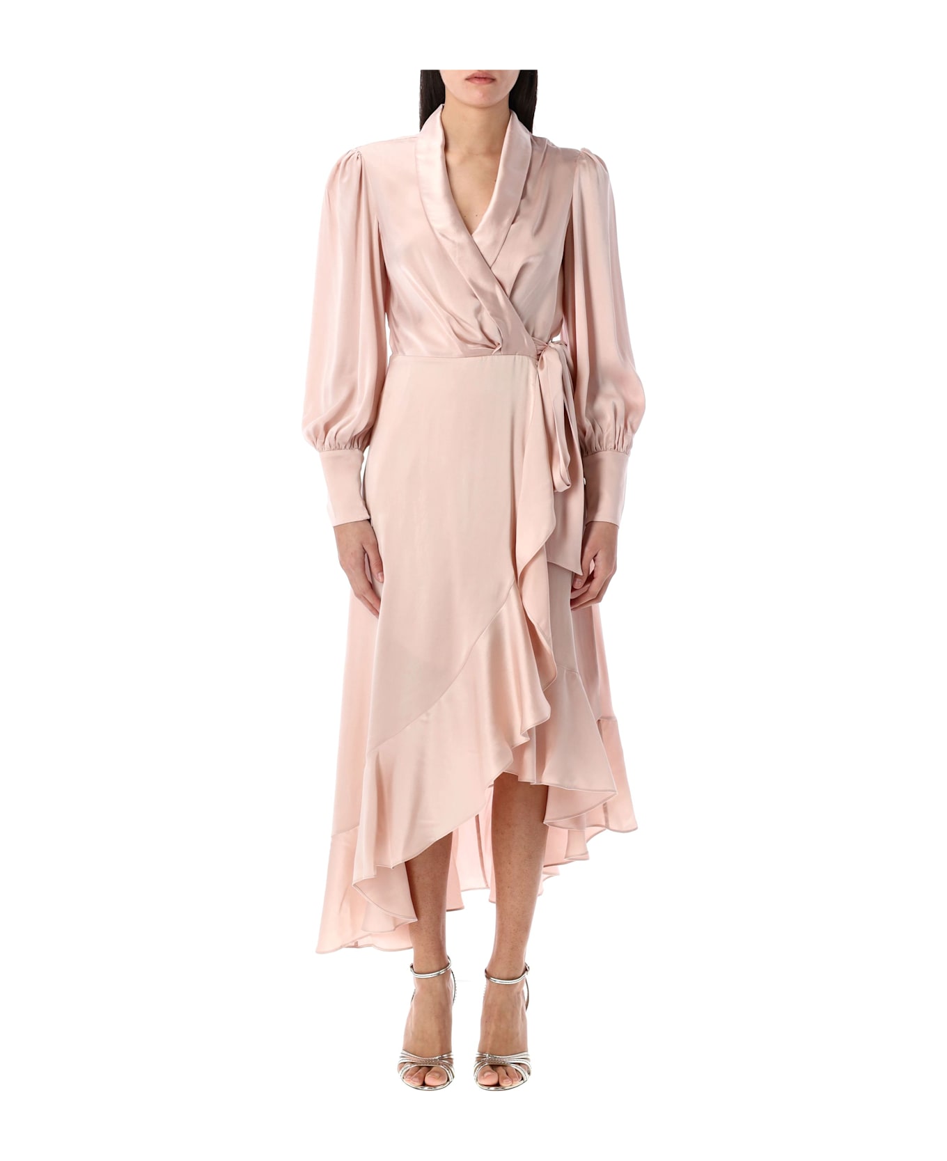 Wrap Midi Dress By Zimmermann. Featuring: Silk Satin Wrap Front Closure Long Puff Sleeevs With Zipped Cuffs Fluid Asymmetric Ruffled Skirt Model Is 1,70 M And Wears Size 1