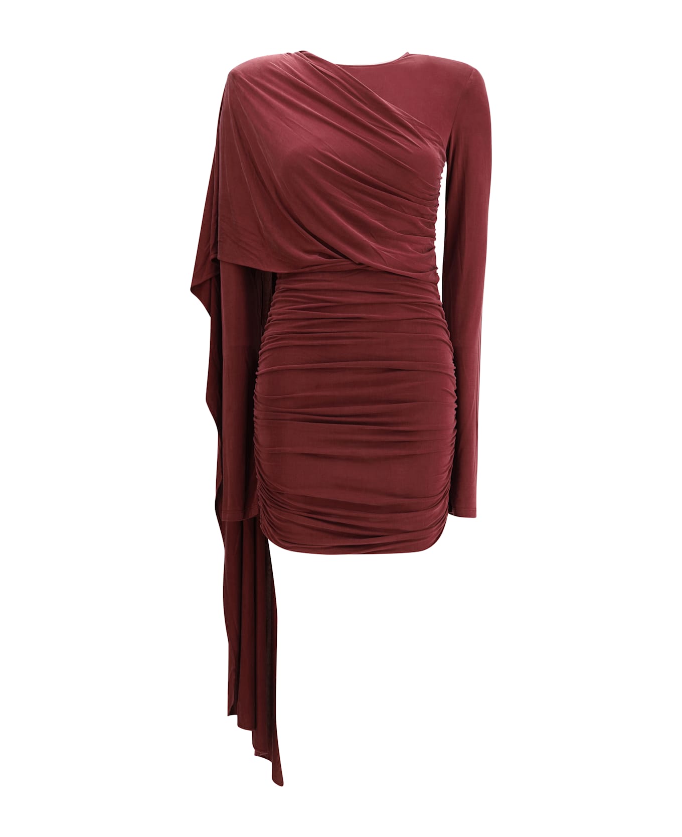 The xenia mini dress by the andamane is a garment with a bold and feminine spirit, made of suede-effect jersey that wraps the silhouette with softness. the long cape draped over the shoulders gives a dramatic and sophisticated touch, while the ruffle along the skirt enhances the shape with elegance. the back zipper closure completes the design with practicality and discretion.
