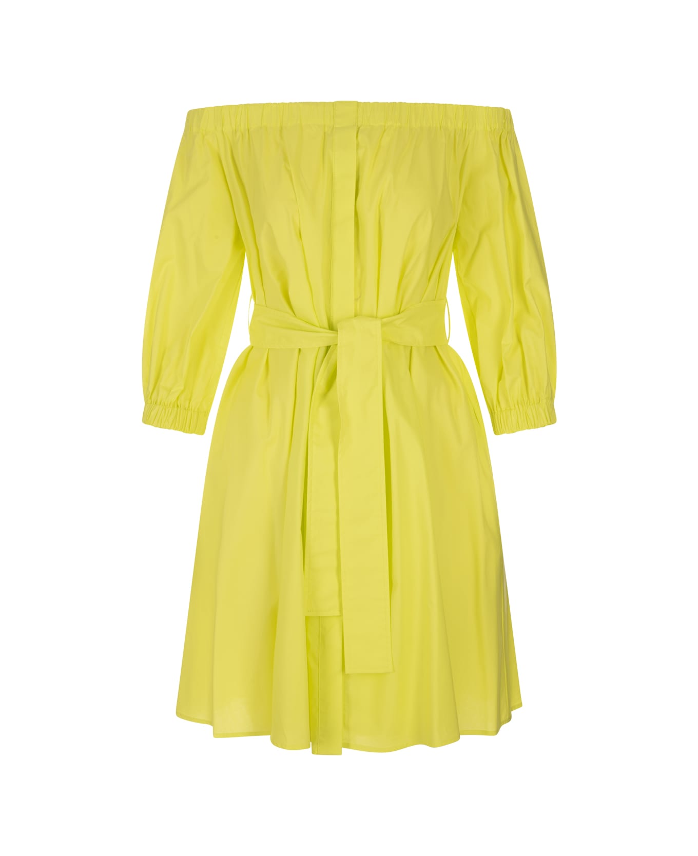P. A. R. O. S. H. mini dress made of yellow cotton with bare shoulders, puffed sleeves, flared skirt, neckline with elasticated cuffs, waistband with matching belt to tie at the front.