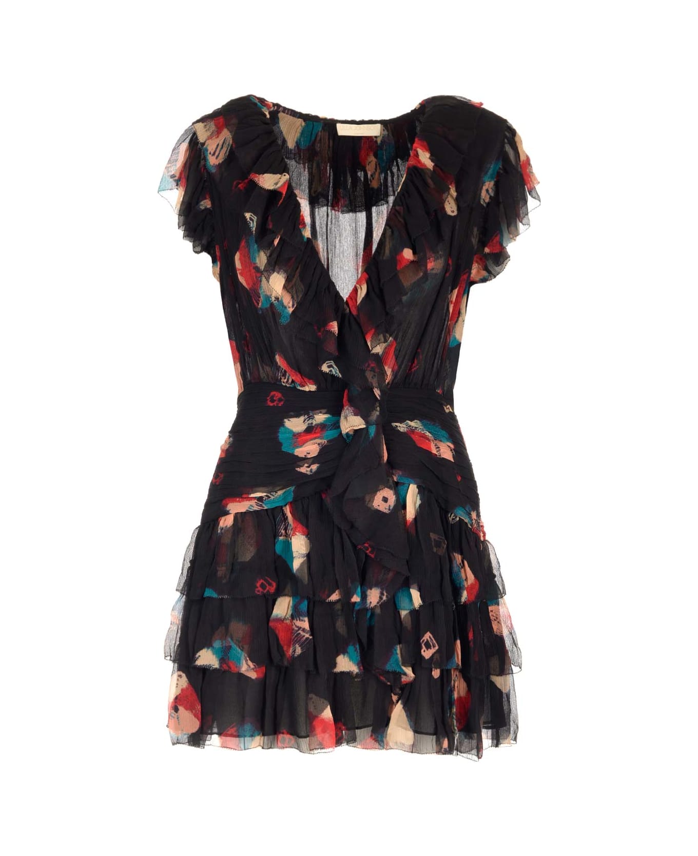 "Zina" printed crepe mini dress from Ulla Johnson, featuring a V-neck, frilled mini skirt and asymmetrical hems.