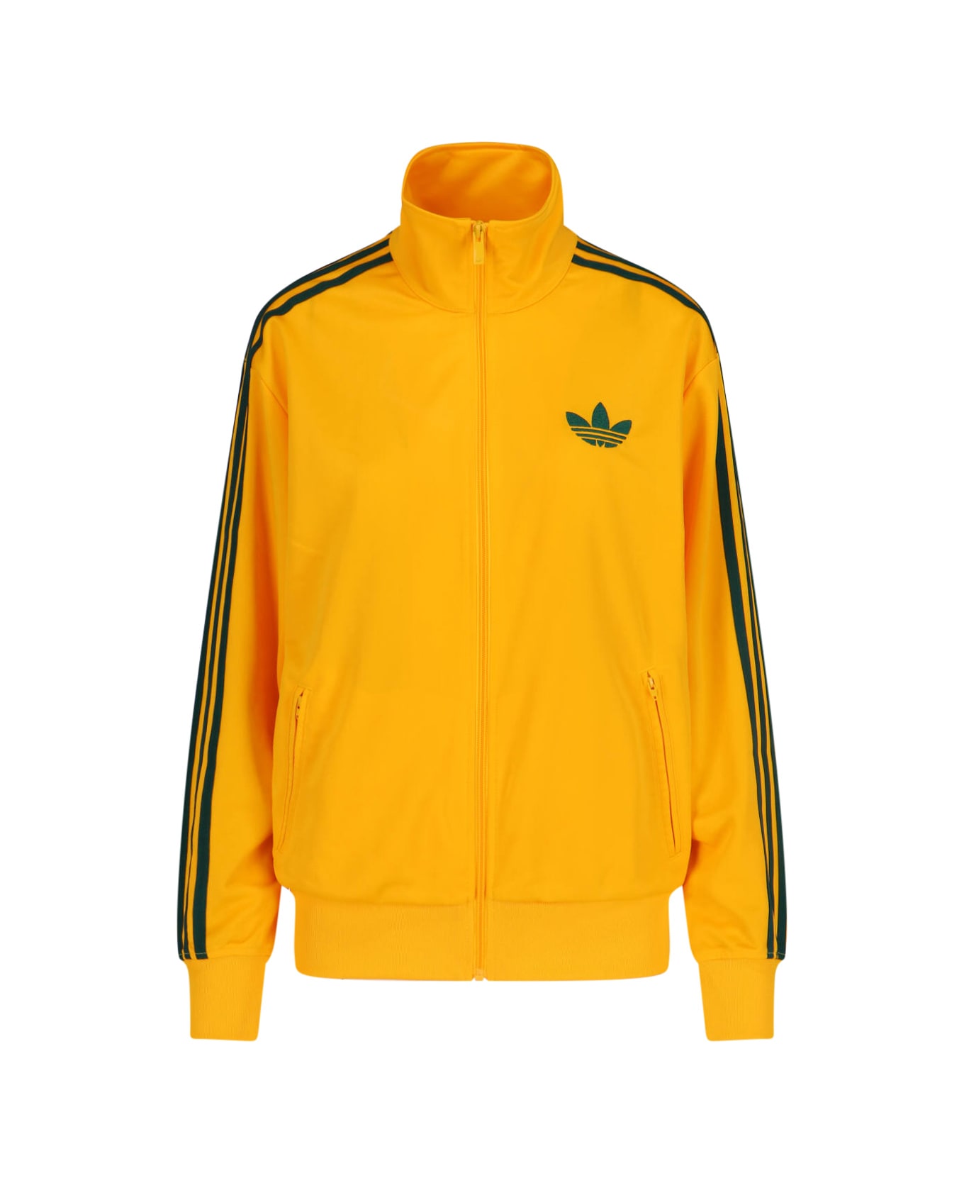 Adidas yellow fabric 'Adicolor Classics Firebird' zip sweatshirt with high neck, zip closure, green 'Trefoil' logo embroidery on the chest, two side zip pockets, iconic green bands on the sleeve, ribbed trims, straight hem.