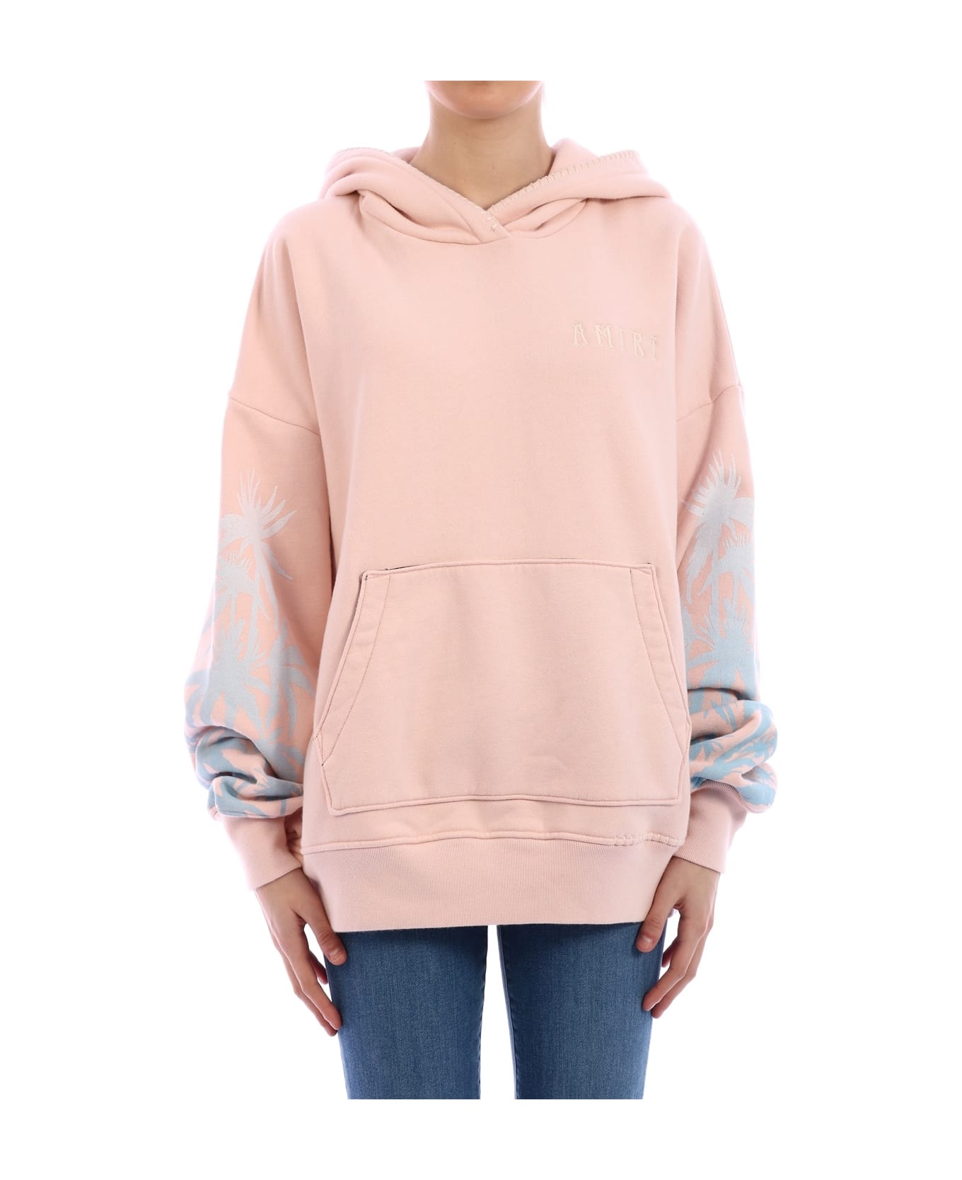 Pink cotton hooded sweatshirt with light blue palm print. Eternal Happiness written on the back. Kangaroo pocket, logo on the chest. The model is 1. 75 cm tall and wears size XS