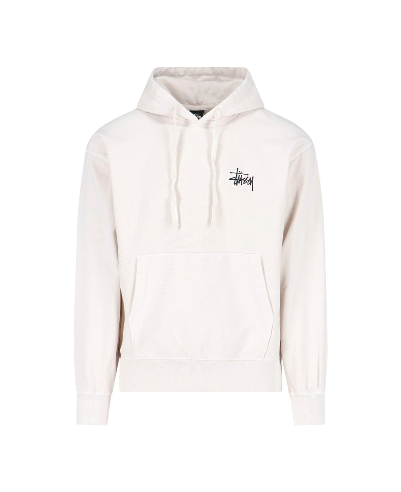 Stussy 'Basic' hoodie in cream cotton blend with drawstring, maxi front pocket, black logo print at the front and back, stretch ribbed trims, straight hem.