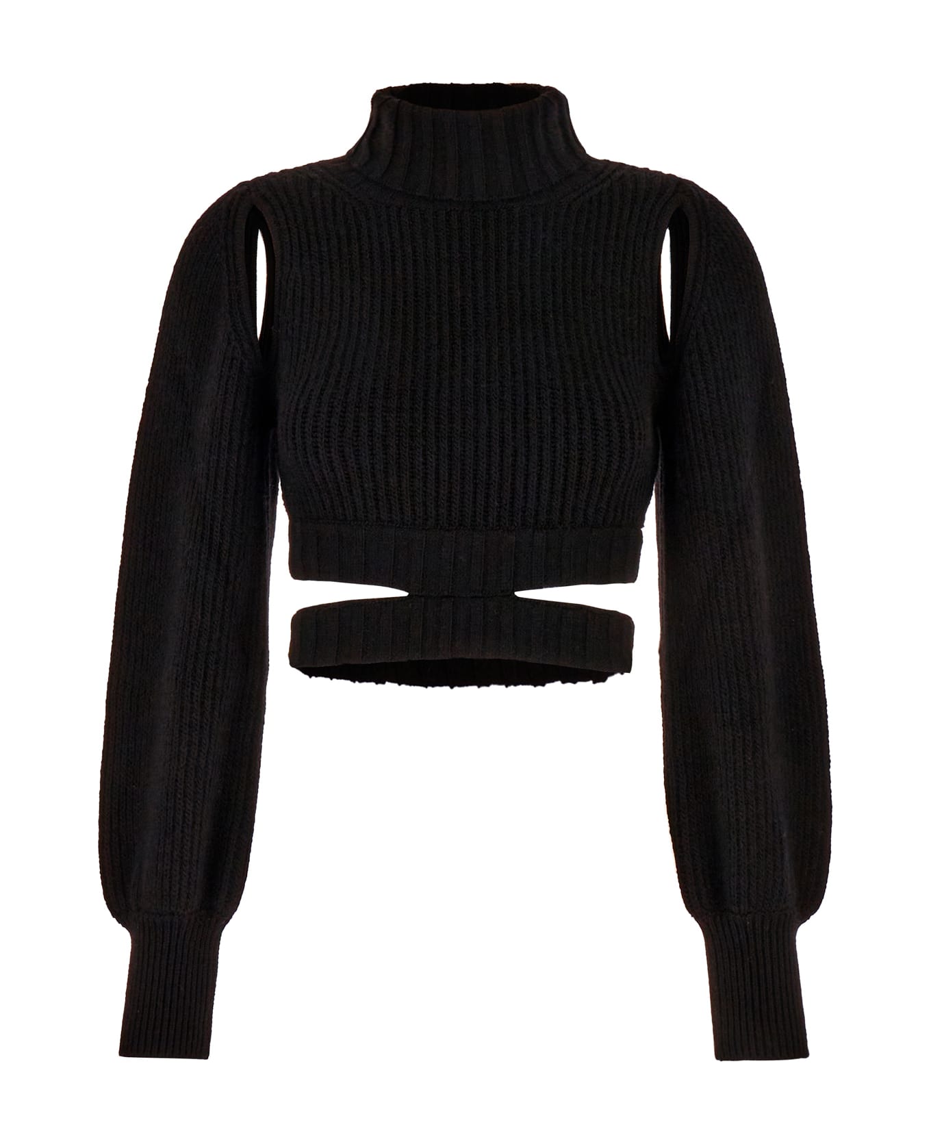Short-cut knitted sweater realized in stretch wool blend enriched by cut-out details on the shoulders and on the hemline. -Ribbed turtleneck, cuffs and hemline