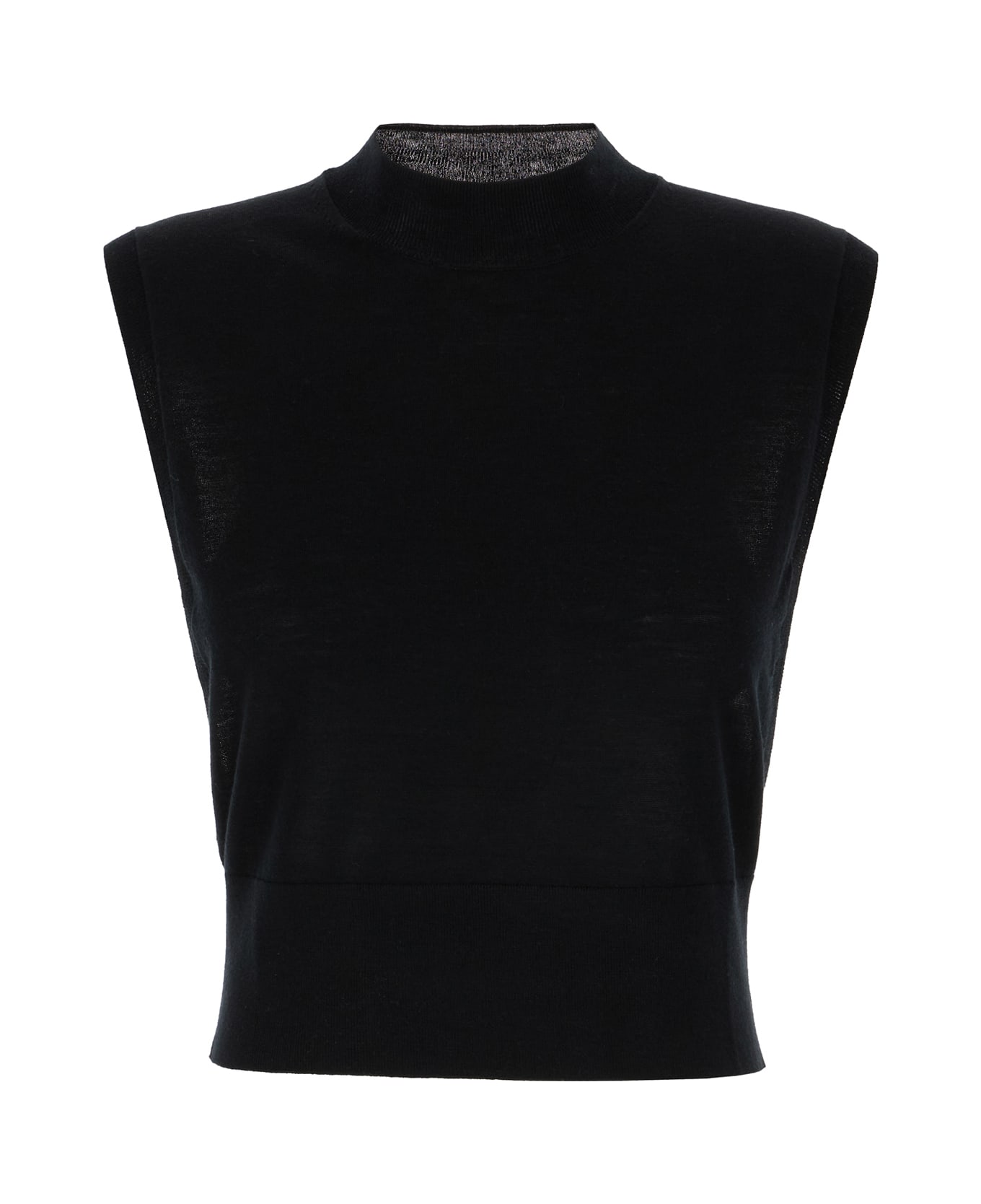 Vest realized in wool blend enriched by rhinestone at the back. -Round neckline -Ribbed trimmings