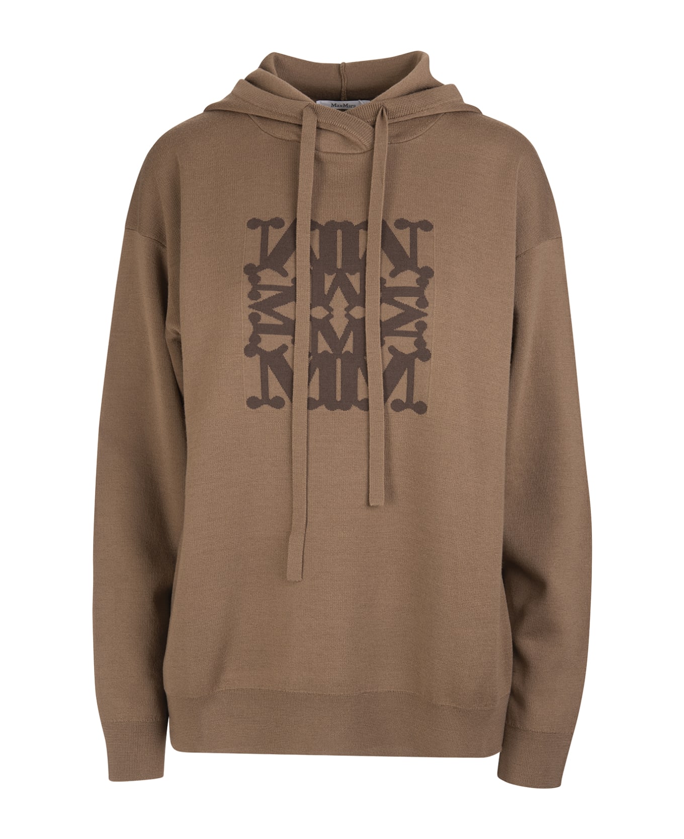 Brown Edy women's hoodie by Max Mara made of light pure wool yarn with jacquard logo placed on the front. Model characterized by a soft fit, hood with drawstring and long sleeves with a low shoulder