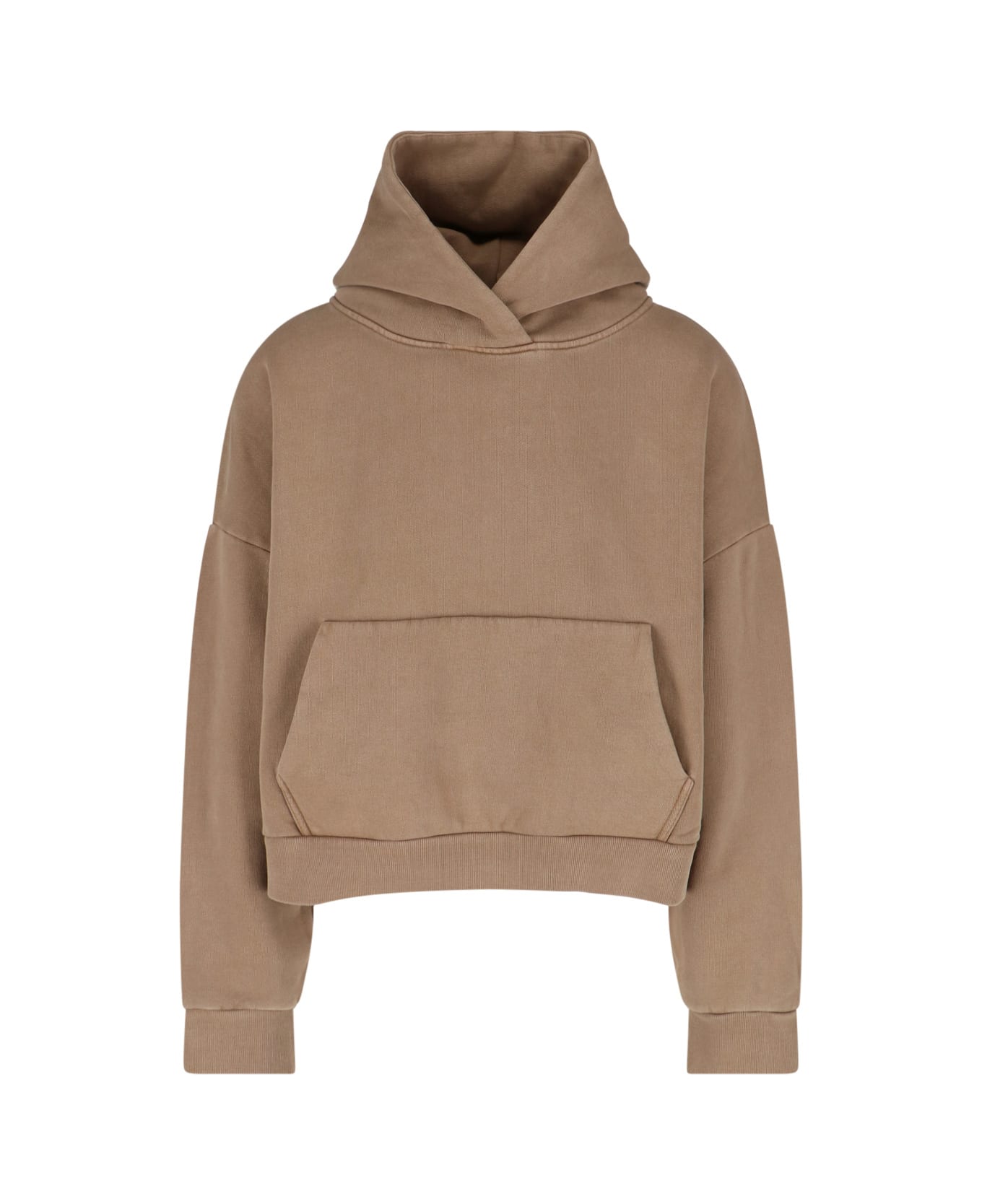 Entire Studios classic hoodie in beige organic cotton with maxi front pocket, ribbed trim, and straight hem.