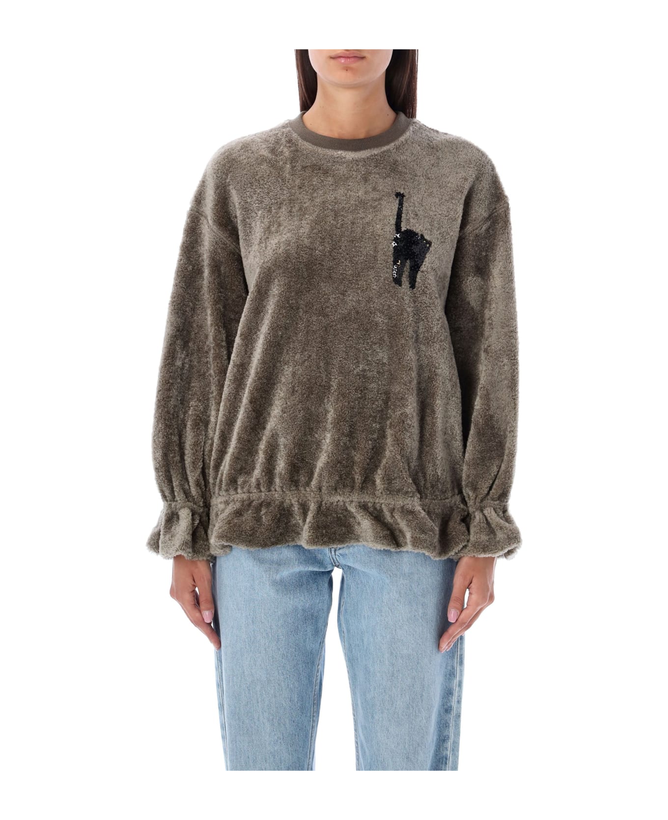 Cotton-blend Crewneck With Sequin Cat By Undercover. Featuring: Ribbed Crewneck Long Sleeves With Poet Cuffs Sequins Cat At Left Chest Elastic Waistband Model Is 1,72 M Tall And She's Wearing Size 1