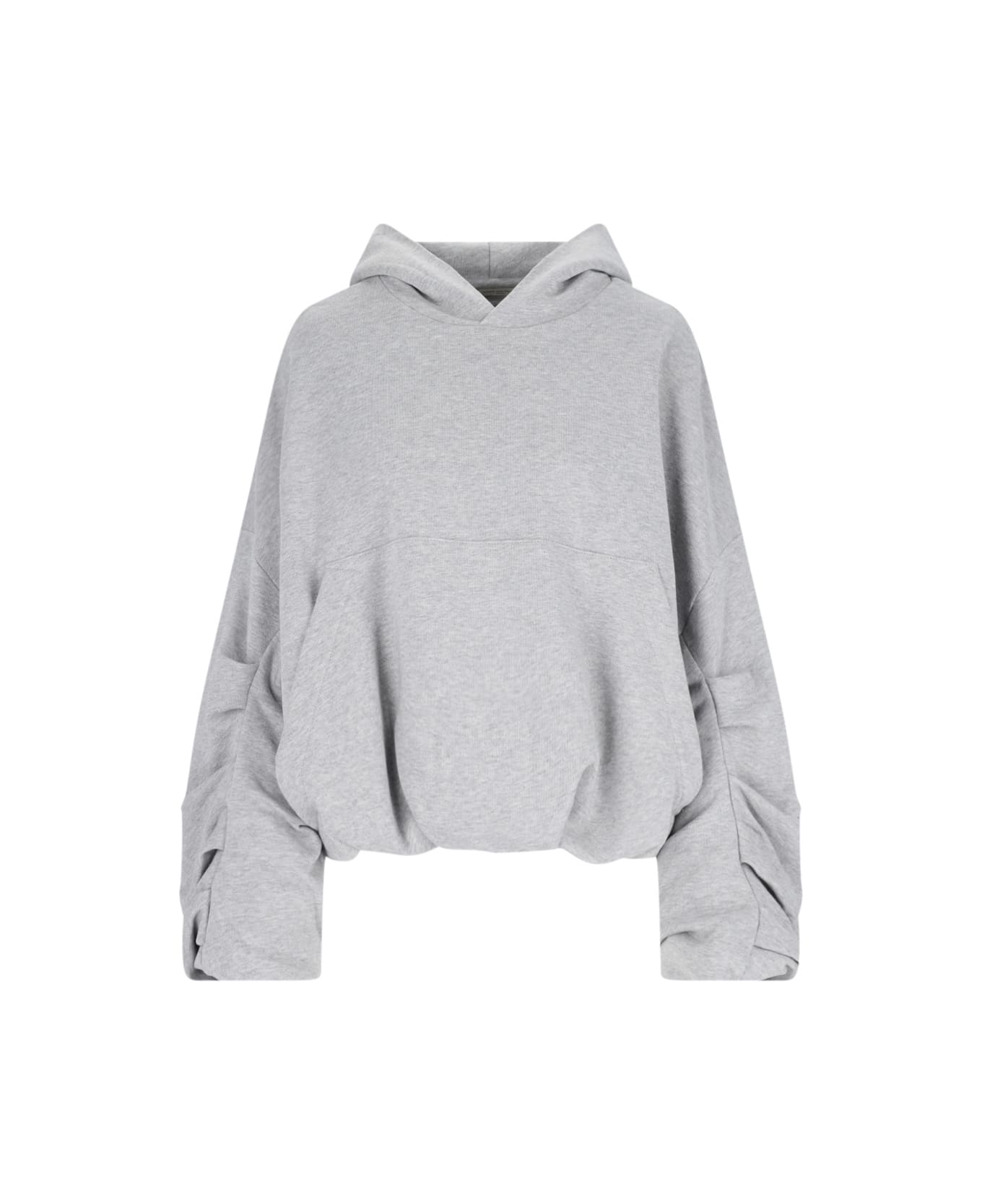 Dris van Noten draped hoodie in grey cotton with drawstring hood, pleated sleeves, maxi front pocket, elastic hem.