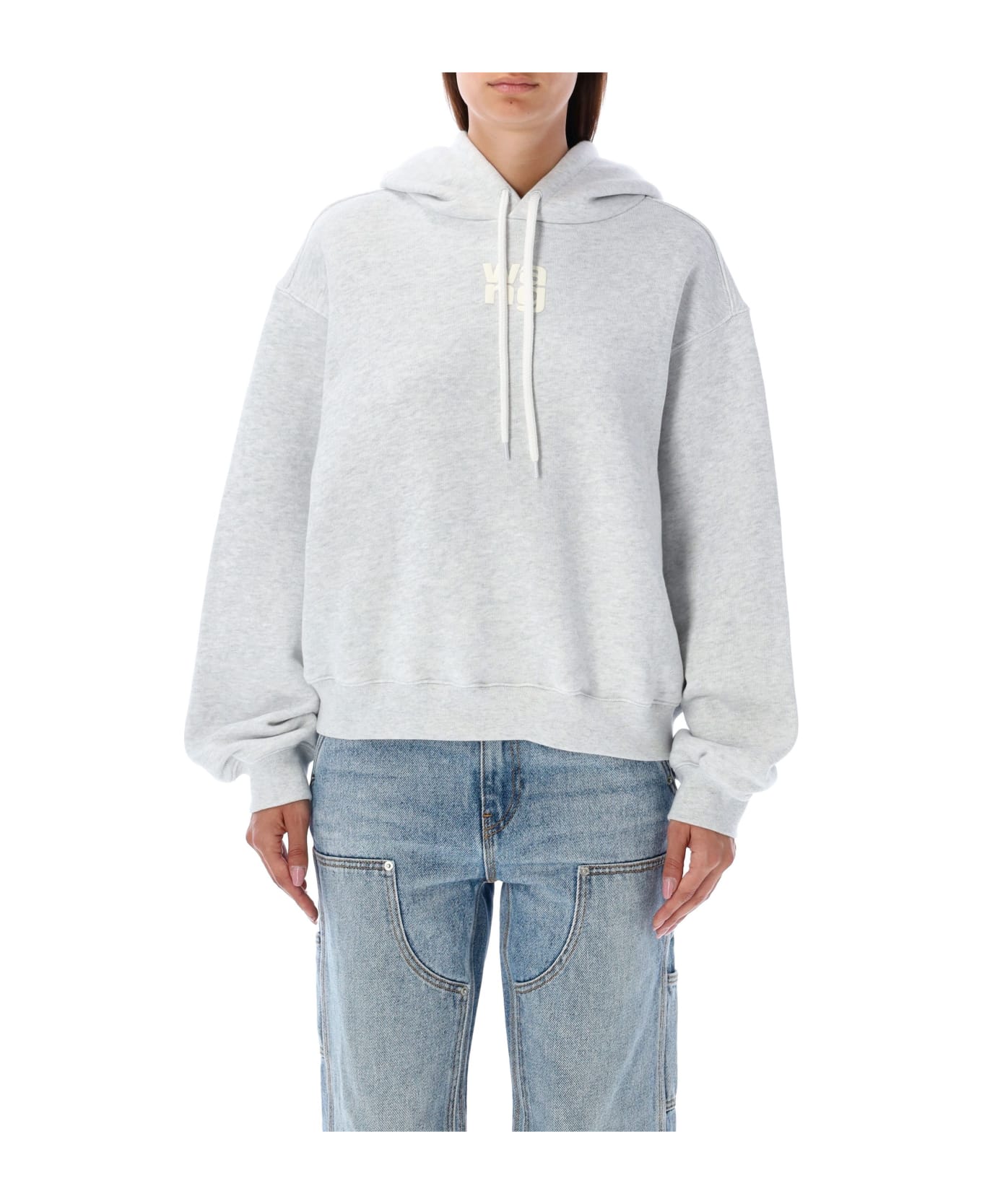 Essential Hoodie Paint Logo By T X Alexander Wang. Featuring: Long-sleeved Hoodie In Heavy Structured Terry Embossed Patent Leather Front Logo Comfortable Fit Ribbed Cuffs And Bottom Hem Model Is 1,72m And Wears Size S.