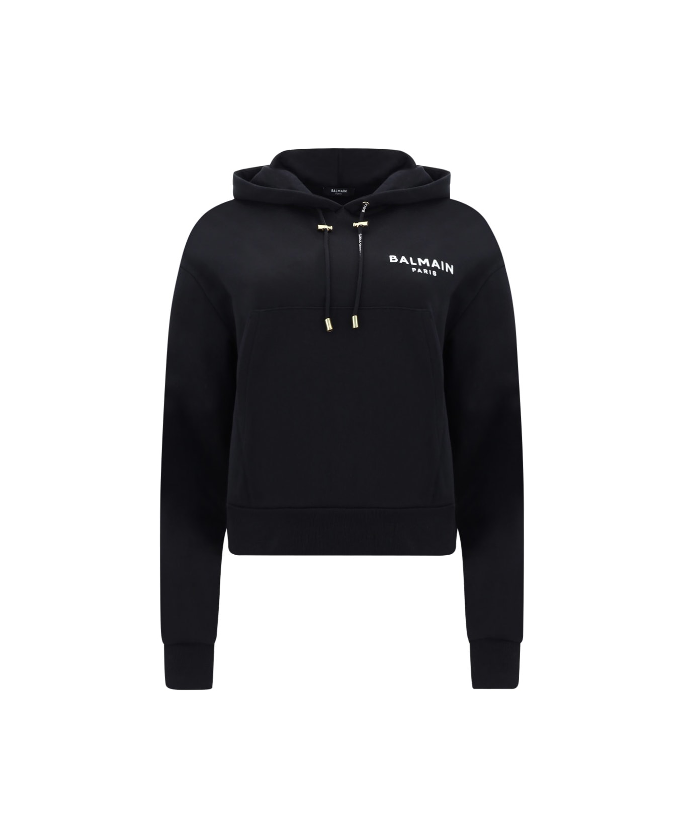 Cotton hoodie by balmain, hood with adjustable drawstring, ribbed cuffs, ribbed hem, iconic brand monogram printed tone-on-tone on front, front kangaroo pocket, crop design, side slits with logoed band detail, regular fit.