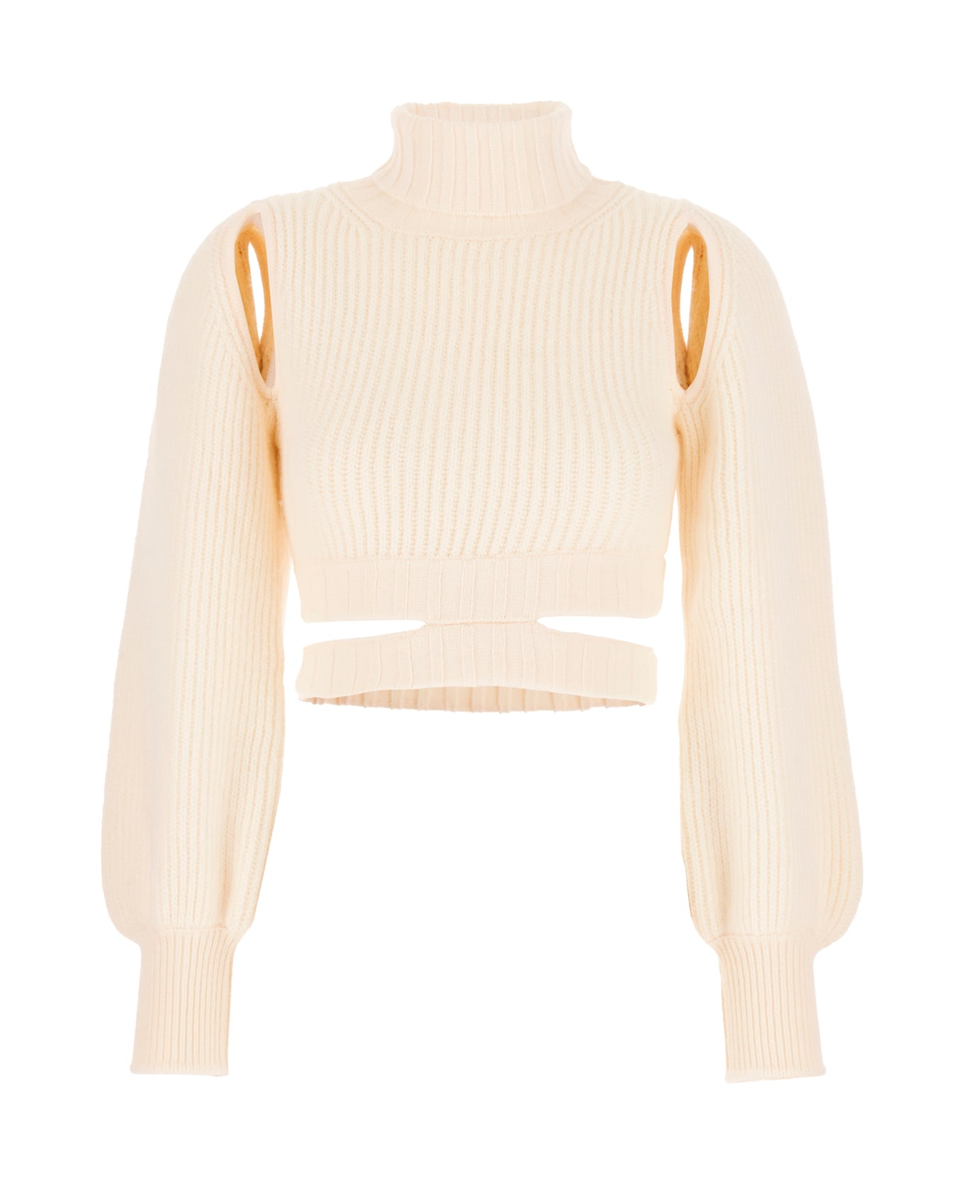 Short-cut knitted sweater realized in stretch wool blend enriched by cut-out details on the shoulders and on the hemline. -Ribbed turtleneck, cuffs and hemline