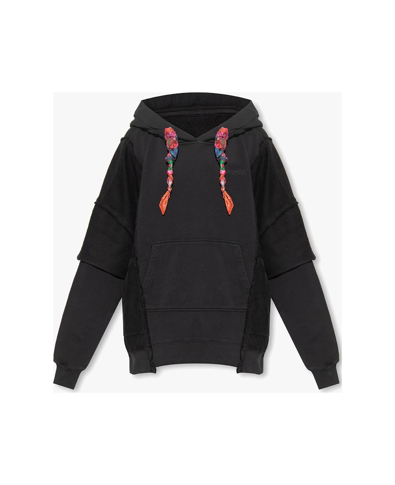 Black oversize hoodie from KHRISJOY. Made of cotton, this design features a logo print, three front pockets, multicolored drawstrings at the hood and ribbed trims at the hem and cuffs.