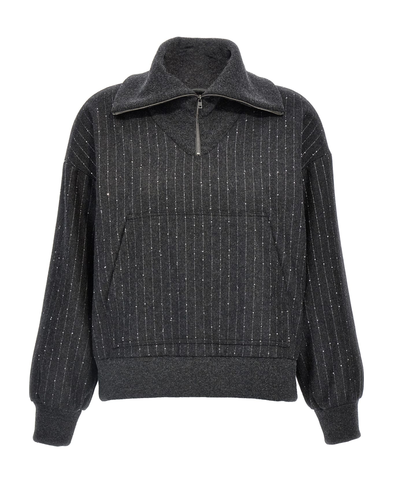 Pinstripe wool blend sweatshirt with sequin appliqué, kangaroo pocket, half zip, long cuffed sleeves. Composition: 65% wool 23% polyamide 7% polyester 5% of