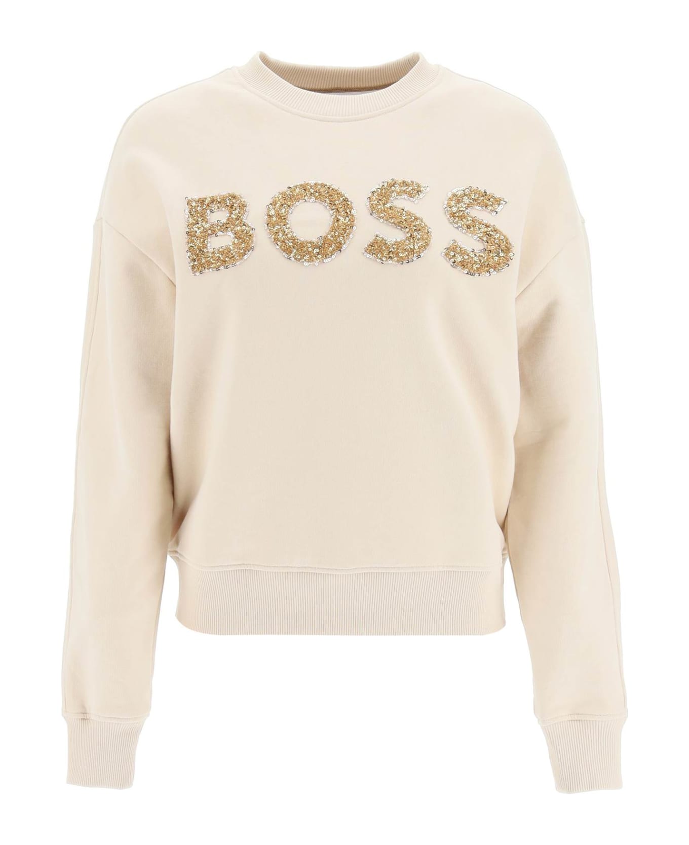 Boss crew neck sweatshirt made of soft loop-back cotton-blend jersey with sequined logo on the front. Boxy cut finished with ribbed trims. The model is 177 cm tall and wears a size XS.