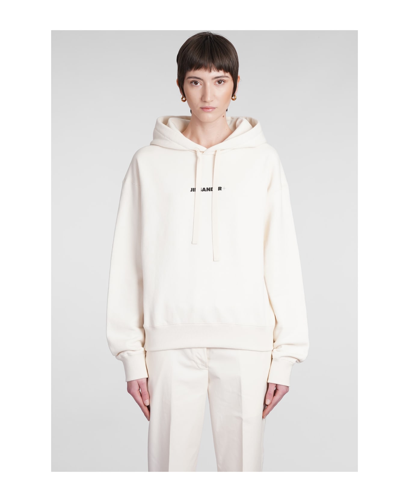 Sweatshirt in beige cotton, adjustable hood with laces, long sleeves, logo print on front, ribbed cuffs and bottom, 100% cotton, Model is 180 cm and wear a size S