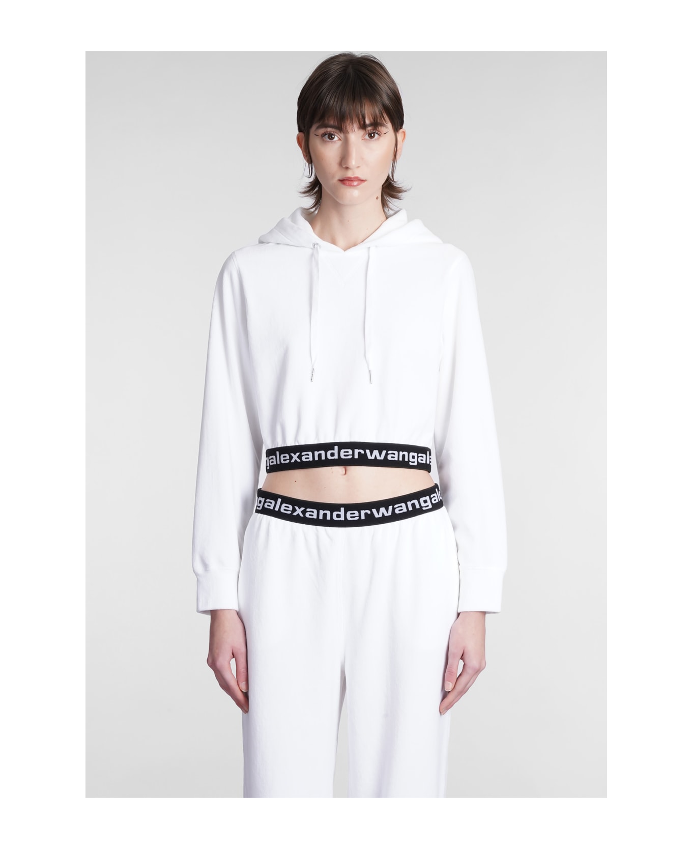 Sweatshirt in white cotton, adjustable hood with laces, crop cut, long sleeves, logo band, 57% cotton 40% polyester 3% elastan, Made in China, Model is 180 cm and wear a size S