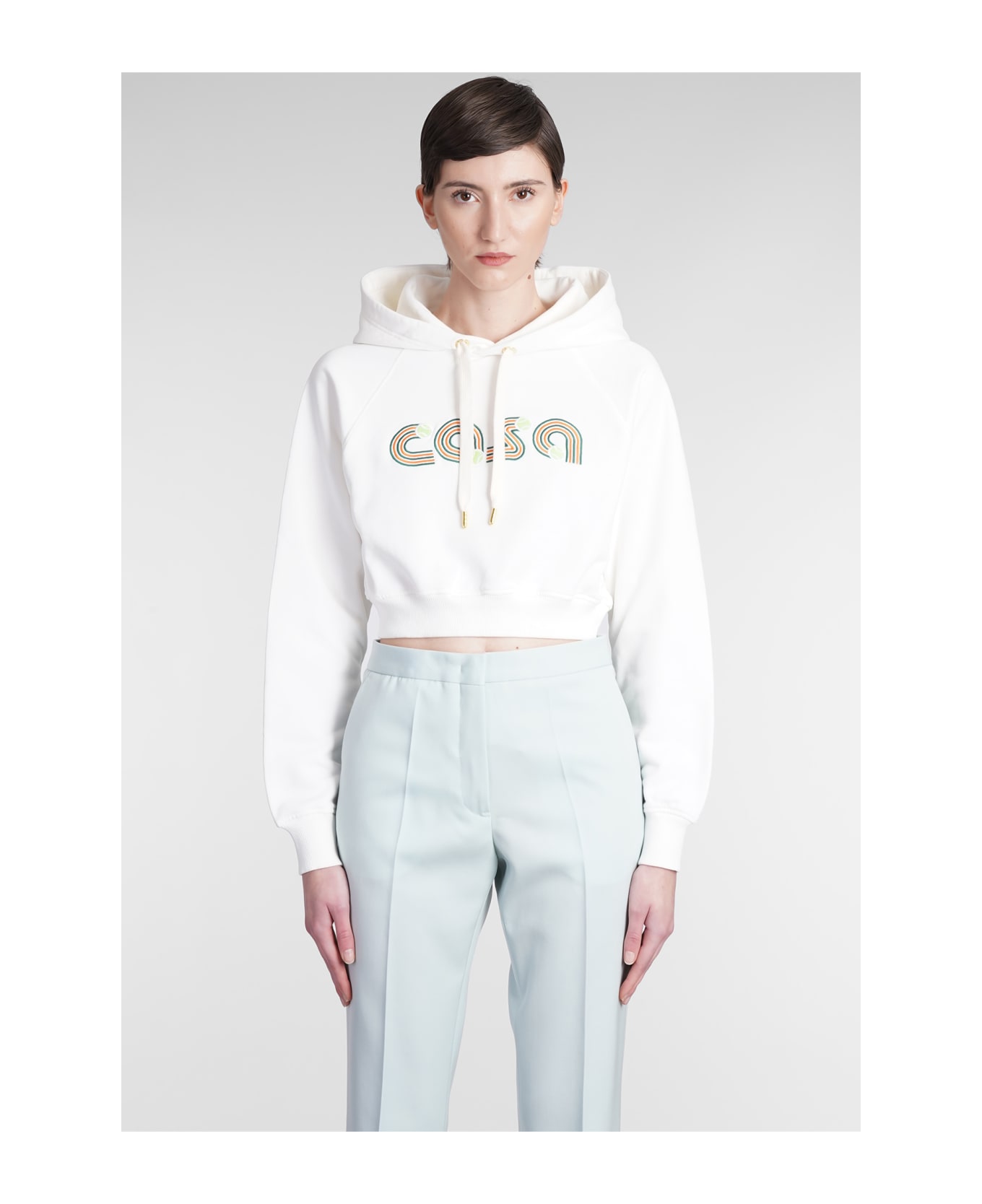 Sweatshirt in white cotton, adjustable hood with laces, crop cut, long sleeves, ribbed cuffs and bottom, front logo, 100% cotton, Model is 180 cm and wear a size S