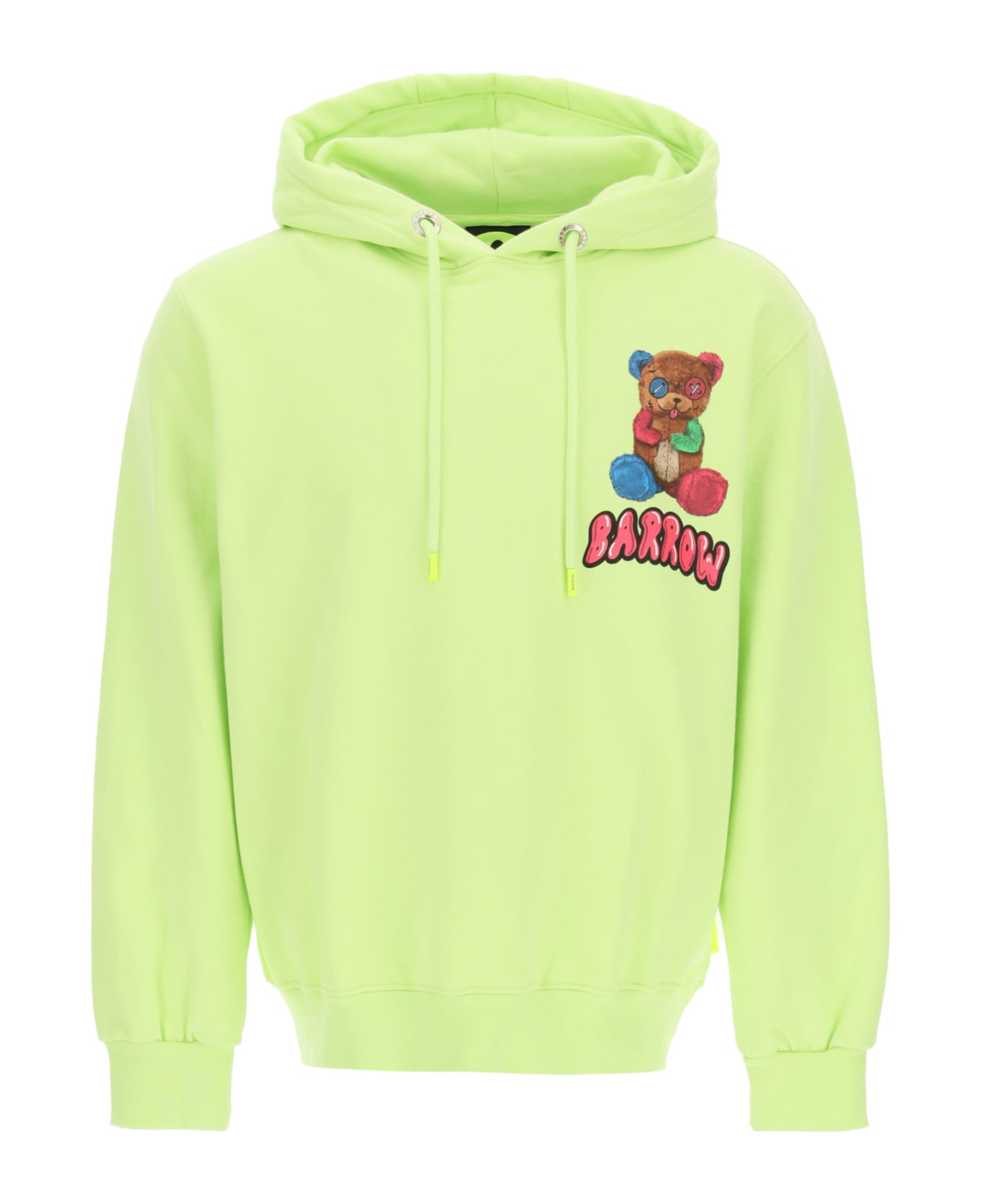 BARROW oversized sweatshirt with drawstring hood, made from cotton jersey, detailed with teddy bear print in bright colors on both sides. It features a reflective logo tag on a side and holographic logo on the hood. Rib-knit stretch finishes. The model is 185 cm tall and wears a size L.