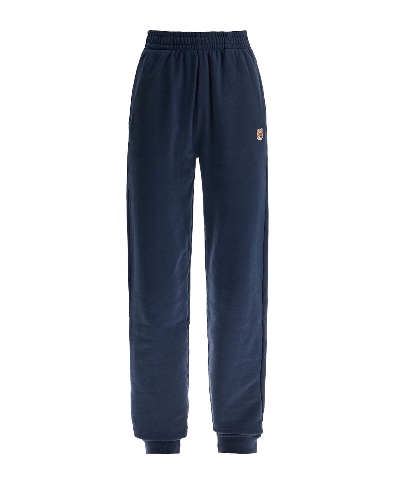 Unisex Maison Kitsuné joggers made of pure cotton brushed jersey, featuring the iconic Fox Head embroidery on the side. They have an elasticated waistband with an internal drawstring, side pockets, a back pocket and ribbed cuffs. The model is 182 cm tall and wears size L.