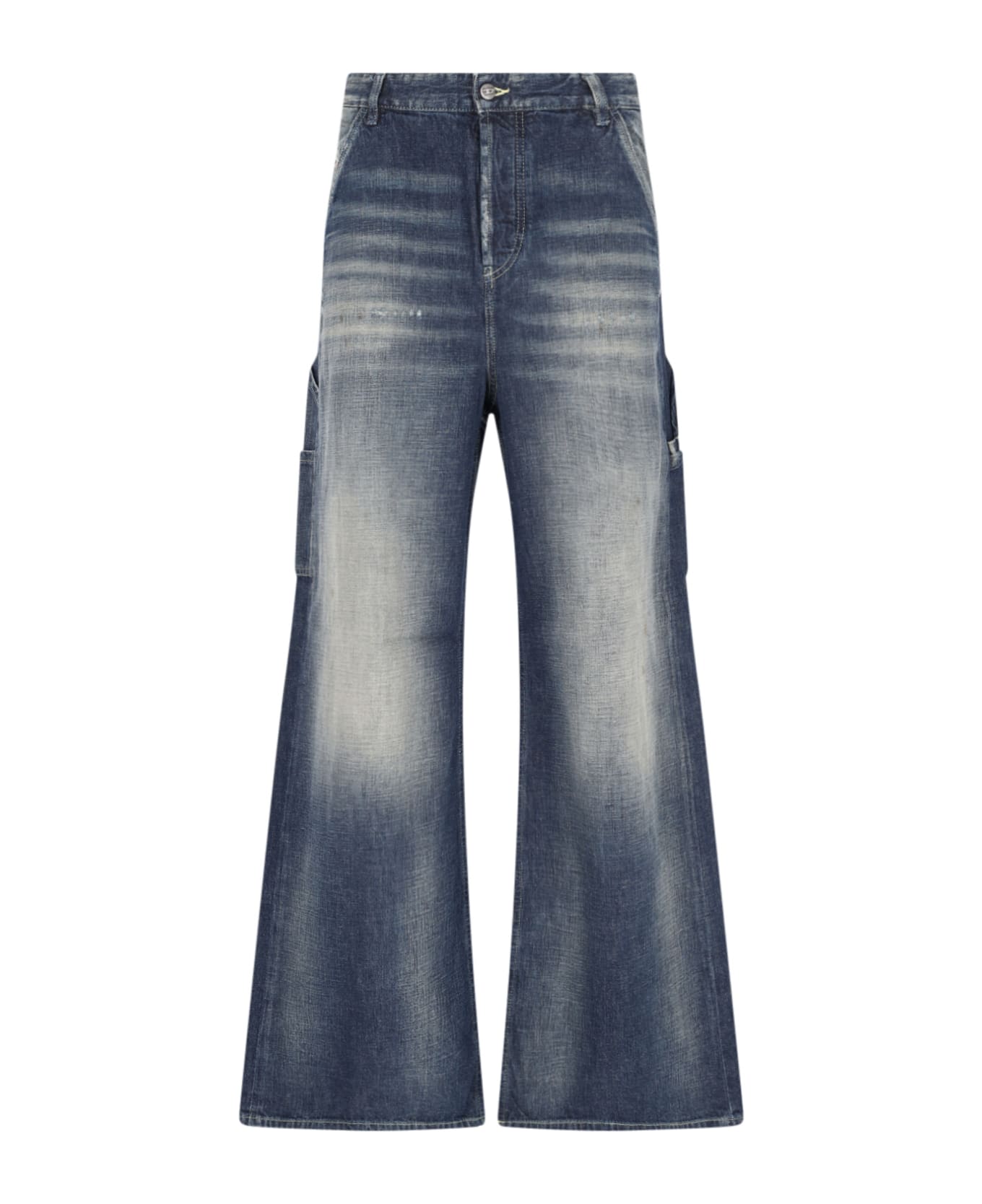 Diesel '1996 D-Sire' blue denim jeans with distressed wash, low waist, belt loops, button closure, two side pockets, side hammer loop, side patch panel, beige logo patch on the back, two back pockets, flared leg. Composition: 100% Cotton