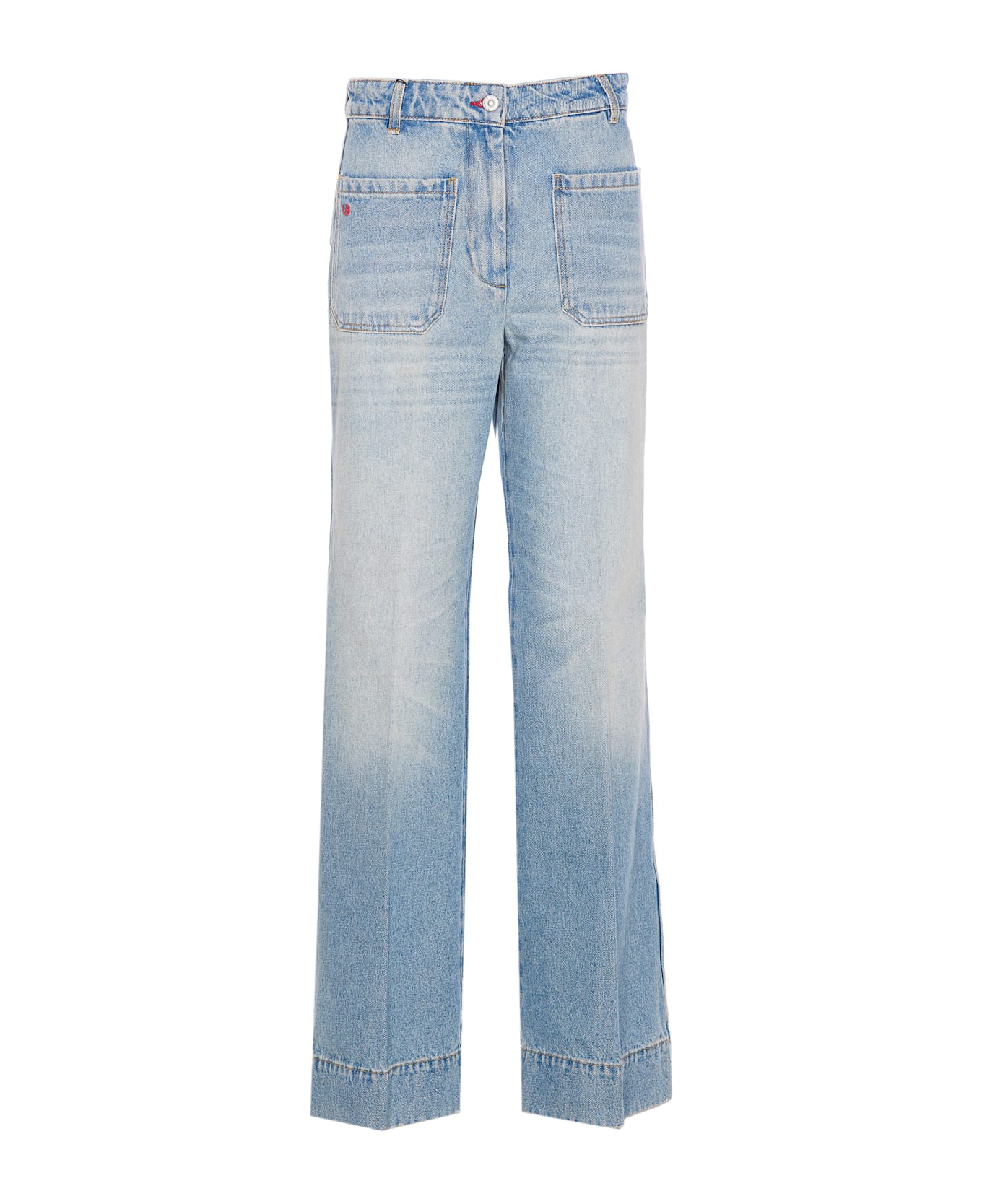 Victoria Beckham denim Alina jeans, frontal button and zip closure, 2 pocket on the front with embroidered mini logo, 2 pockets on the back, patch logo on the back, high waist, wide model