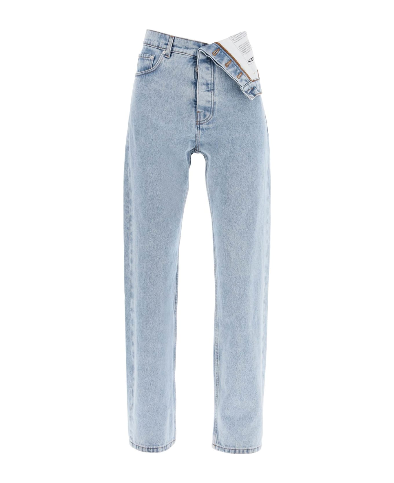 These Y/PROJECT five-pocket jeans are made of light wash organic cotton denim and stand out for their asymmetrical folded waist that reveals a leather jacron with contrasting lettering on the front. They feature hidden button closure and a relaxed fit.