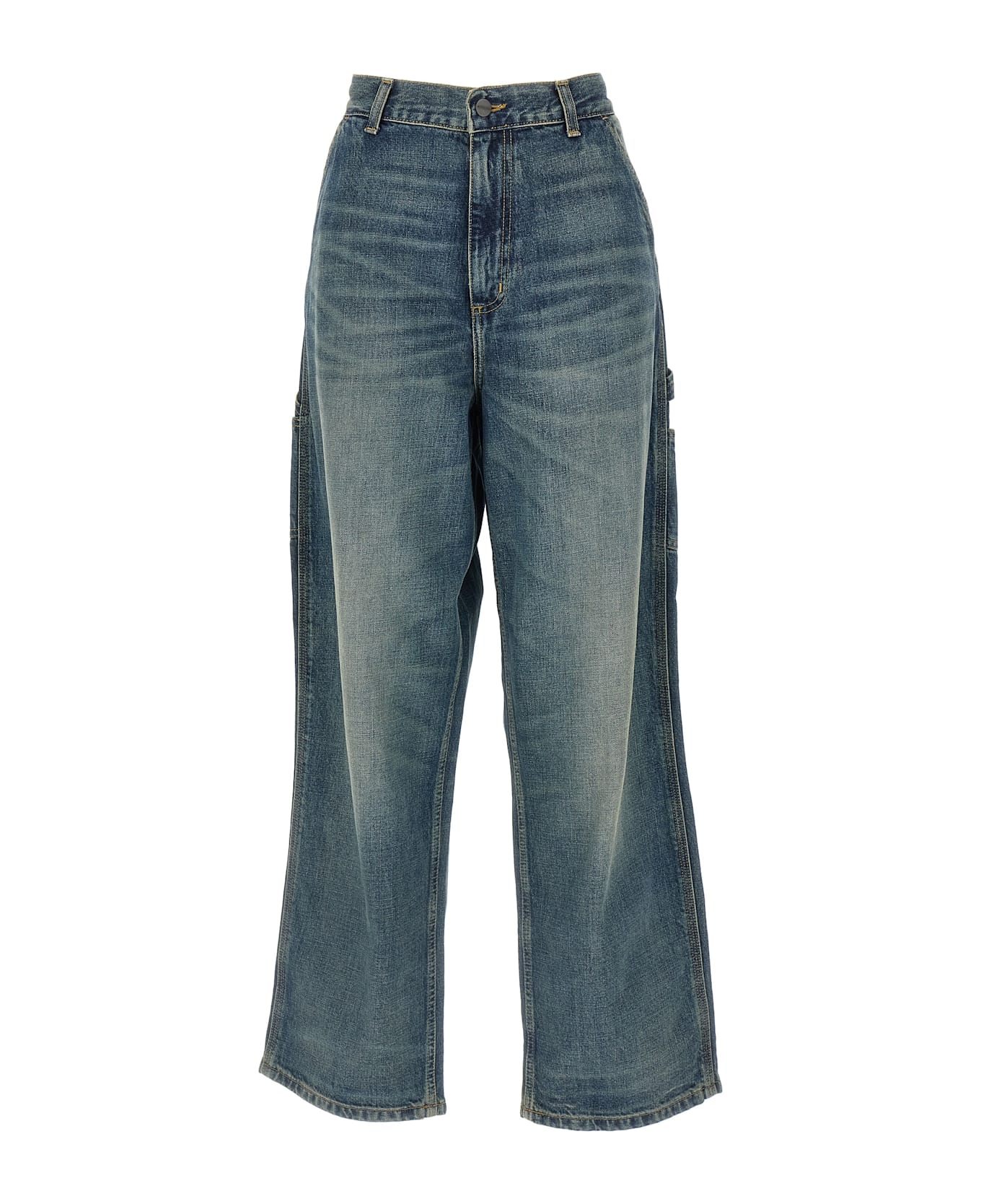 'Brandon Single Knee' jeans in heavy Camano stonewashed cotton denim with contrast stitching, low crotch, wide straight leg, front zip and button closure, five pockets, and back logo patch. Composition: 100% cotton