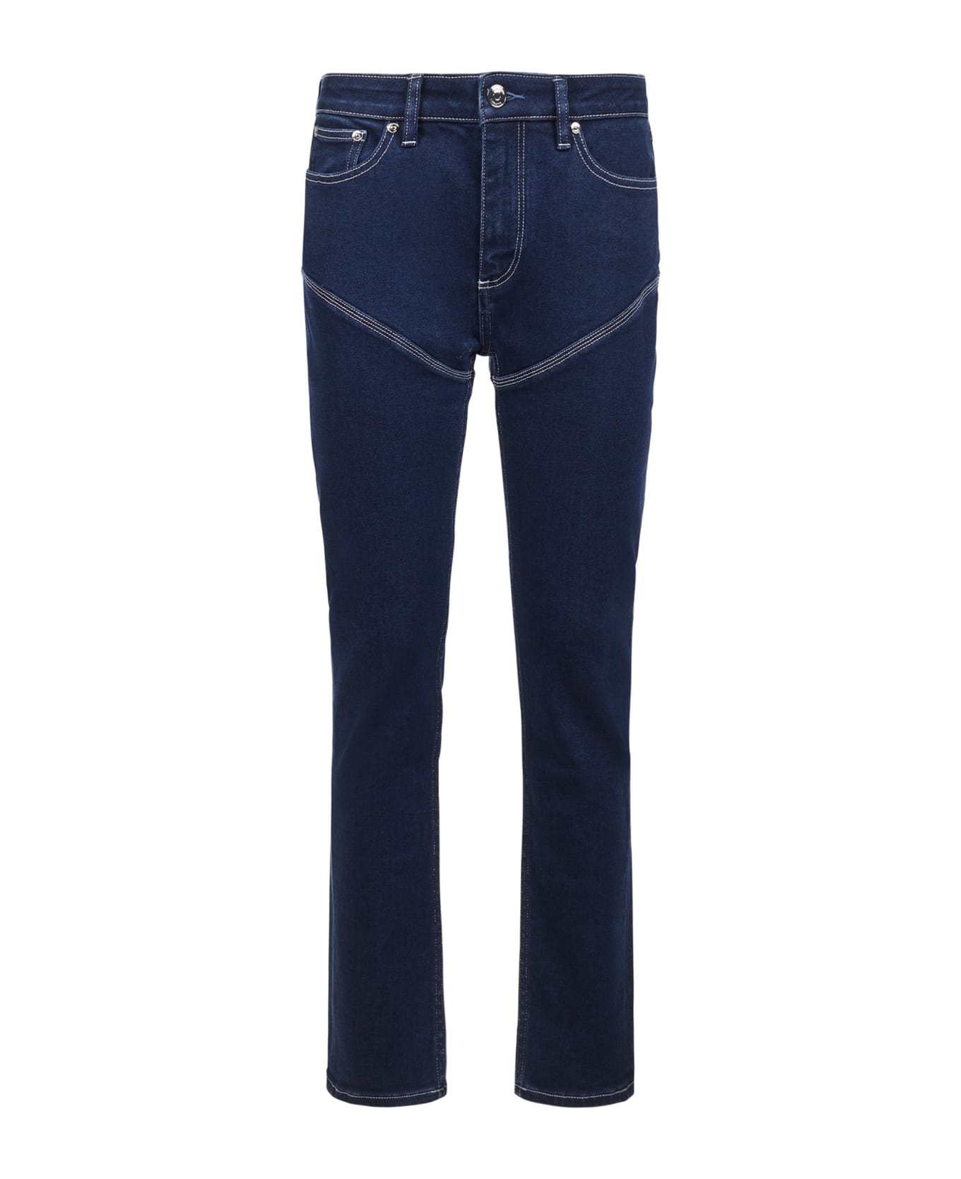 The skinny jeans by Burberry are made of cotton denim dyed a full blue decorated with contrasting white stitching. Characterized by the classic five-pocket design it is enriched on the back by the logoed leather label.