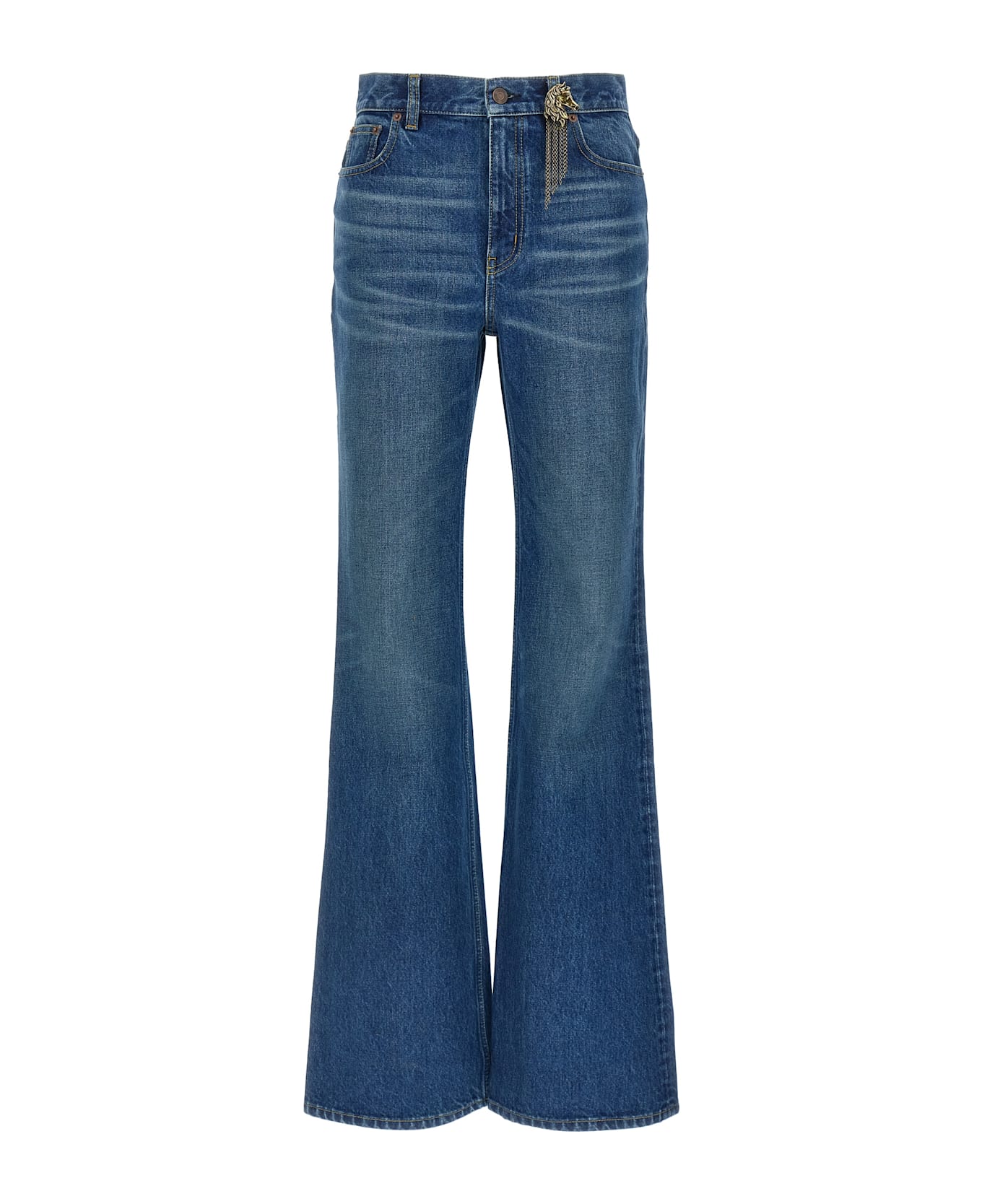 Cotton denim jeans with Indigo wash, contrast stitching, high waist, Gold brass horse-shaped charm, flared leg, front zip and button closure, five pockets, and leather logo label at the back. SUSTAINABLE: This product is made with organic cotton. The organic cotton production system contributes to the health of the soil, the ecosystem and people by eliminating the use of toxic and persistent organic pollutants and at the same time increasing water conservation.