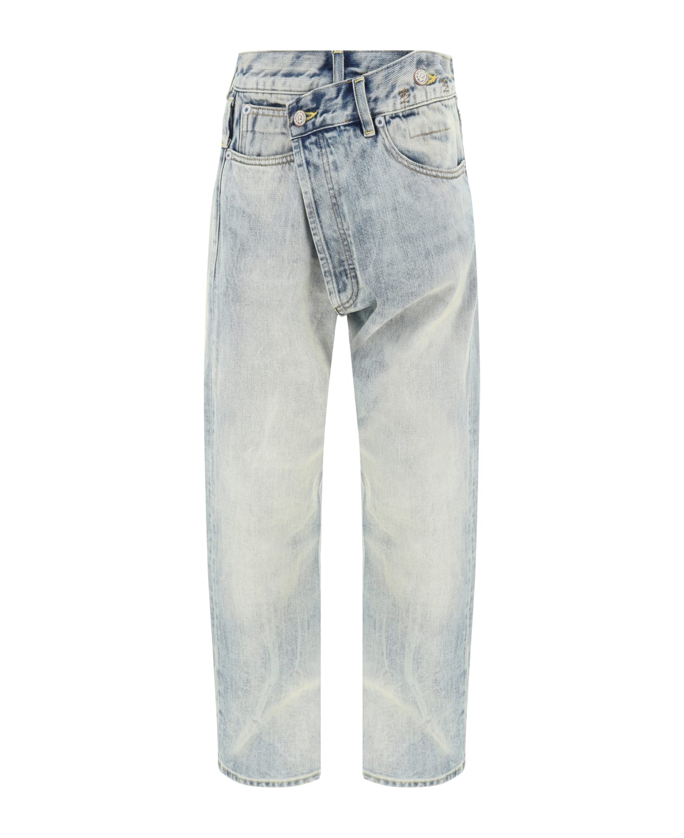 Cotton cross over jeans by r13, asymmetrical button and zip front fastening, straight five-pocket design, belt loops on waistband, leather patch with iconic brand signature press-stamped appliqué on back, distressed and vintage effect design.