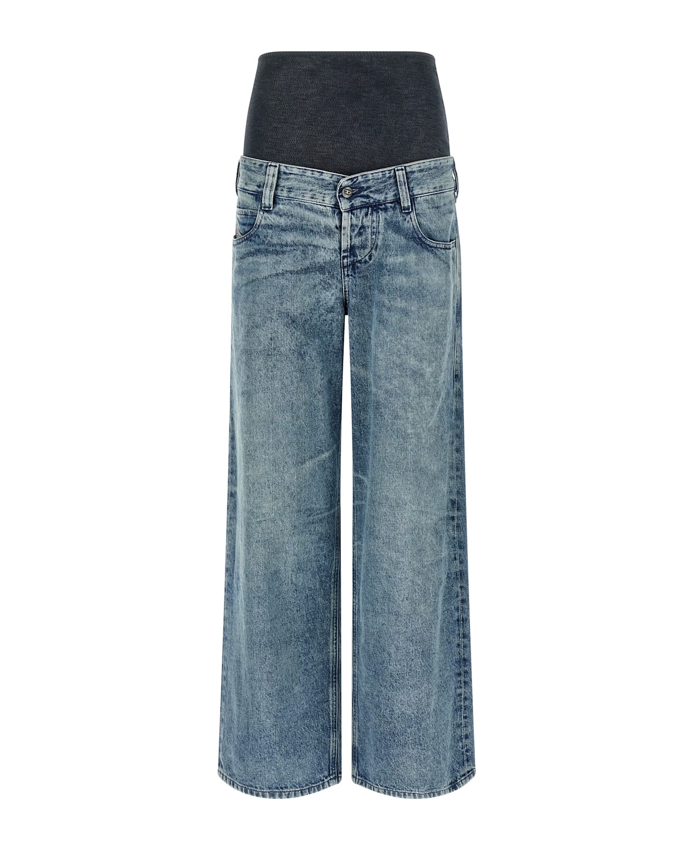 'D-Eni-F-Fsh1' stonewashed cotton and hemp denim jeans with whisker and high baschina that wraps around the waist in technical material fabric, low crotch, wide and straight leg, front button closure, five pockets, back leather logo tag. Composition: 80% cotton 20% ca