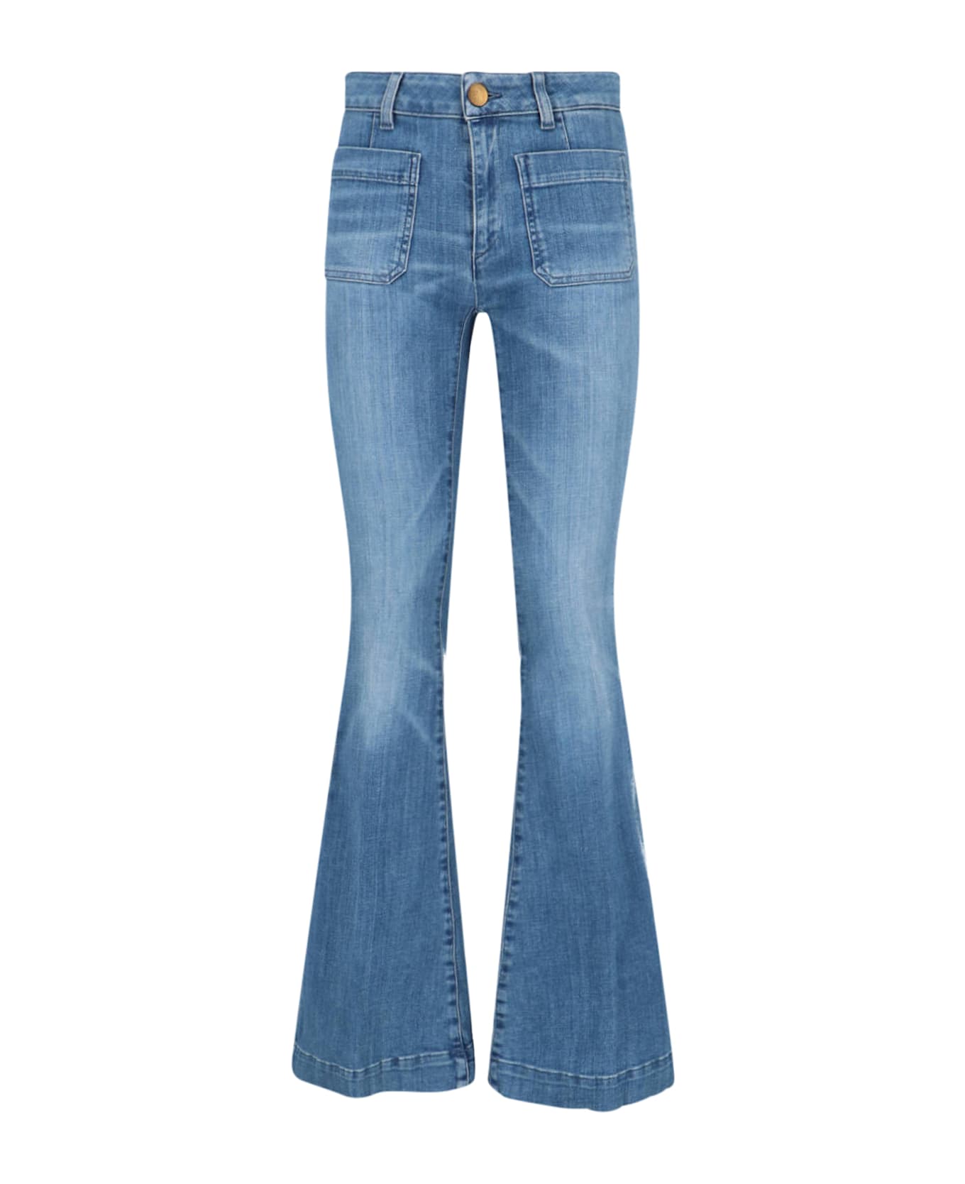 Seafarer 'Delphine' blue denim bootcut jeans with distressed wash, high waist, belt loops, button and zip closure, two flat front pockets, two flat back pockets, red stitching at the back, cream logo embroidery on the back, straight leg.