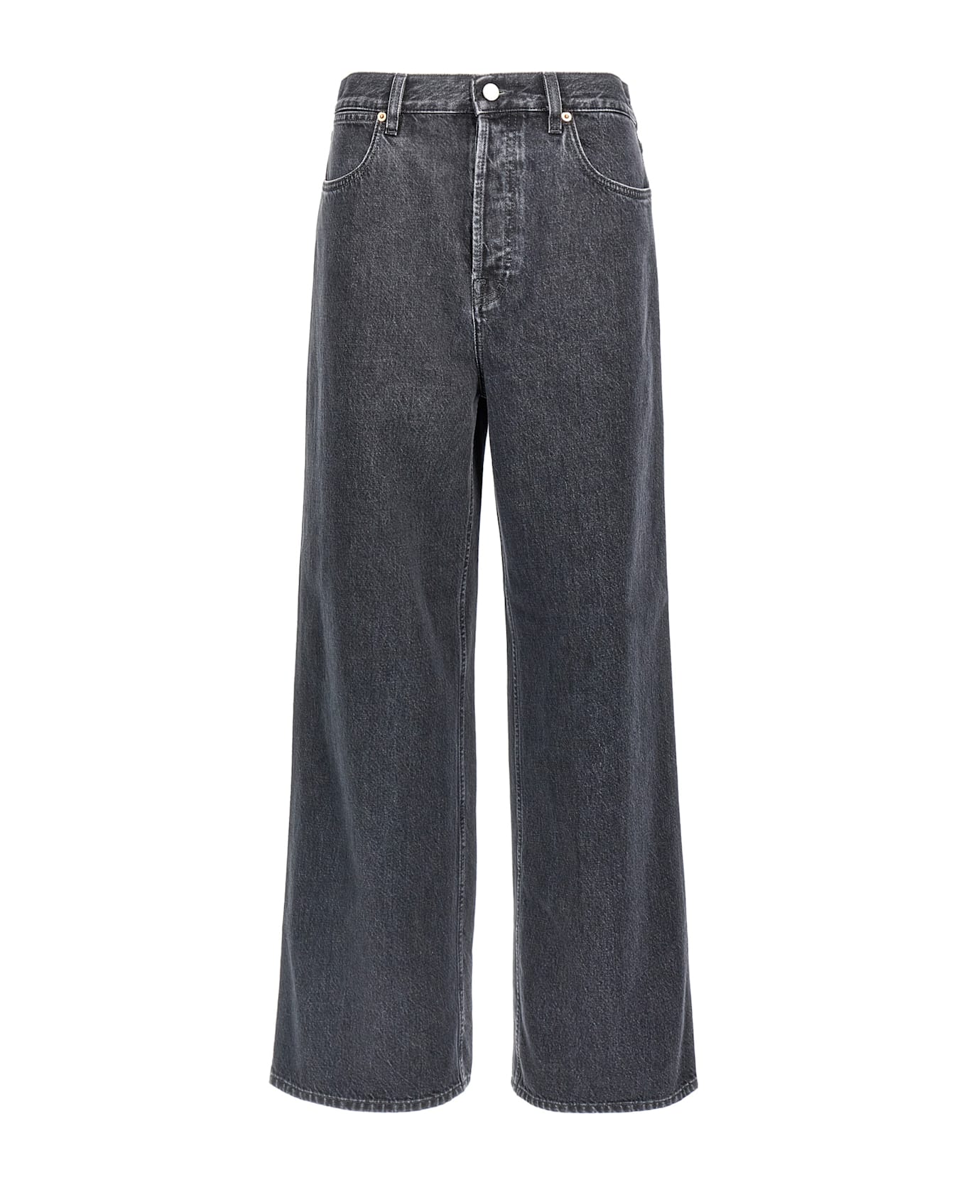 High-waisted cotton denim jeans with wide leg, pockets, button closure, Gucci Red naplak logo tag Back anchor. This product is made with craft techniques, possible variations between one item and another are to be considered characteristics of the product.
