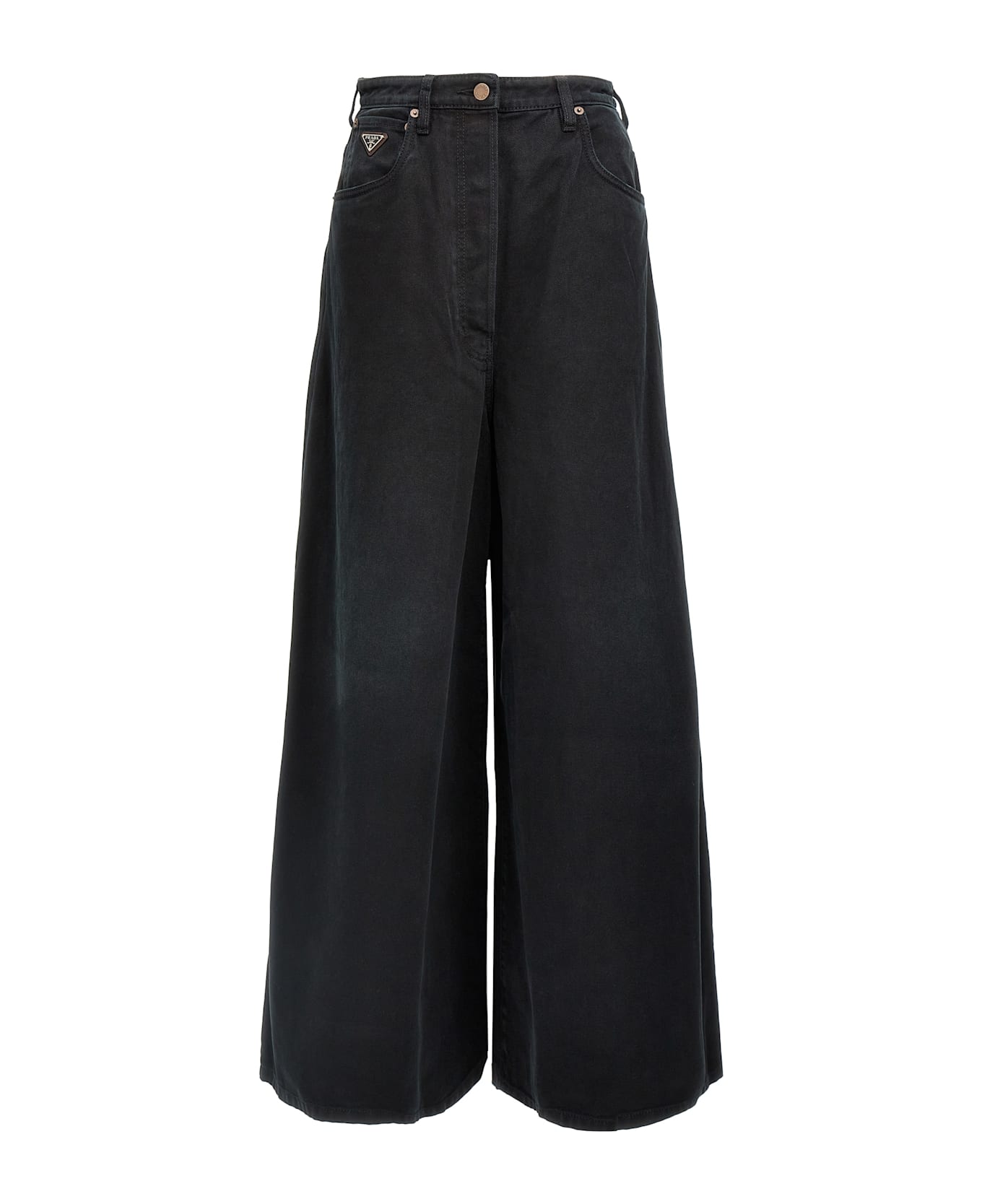 High-waisted cotton denim jeans with button closure, five pockets, triangle metal enamel logo appliqué, back logo tag, and very wide leg. Composition: 100% cotton