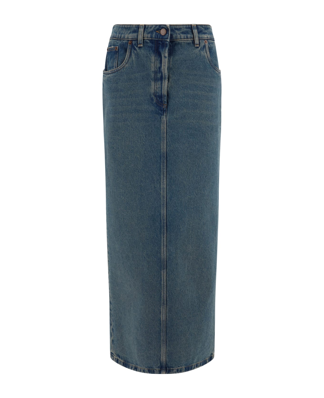 Cotton denim skirt by prada, five-pocket design, front button and zipper closure, belt loops waistband, deep back slit, iconic enameled triangular brand signature plaque applied to back pocket, regular fit. Composition: 100% % Cotton