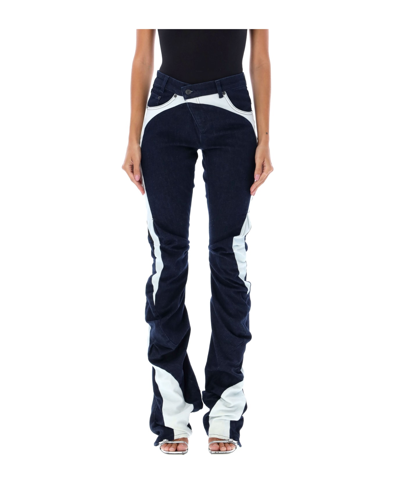 Drape Triple Denim Jeans By Ottolinger. Oblique Zip And Button Closure Slant Side Pockets Bicolor Belt Loops Contrasting Inserts On Side Bicolor Rear Patch Pockets Branded Logo Patch At Back Asymmetric Slim Leg Model Is 1,72 M Tall And She Is Wearing Size S