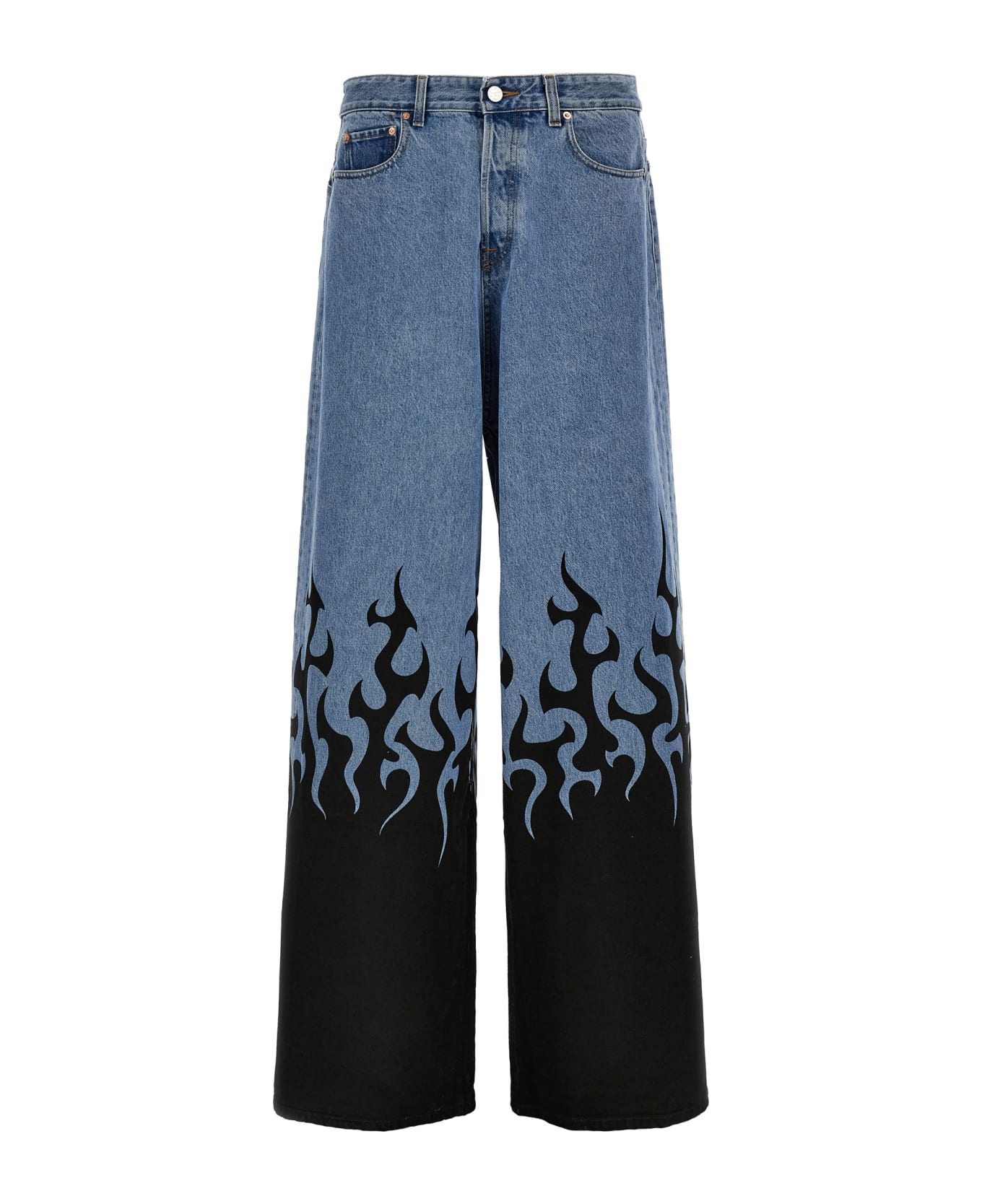 Flame denim jeans with flame print on the legs, and flared-cut. Front button fastening. Composition: 100% cotton