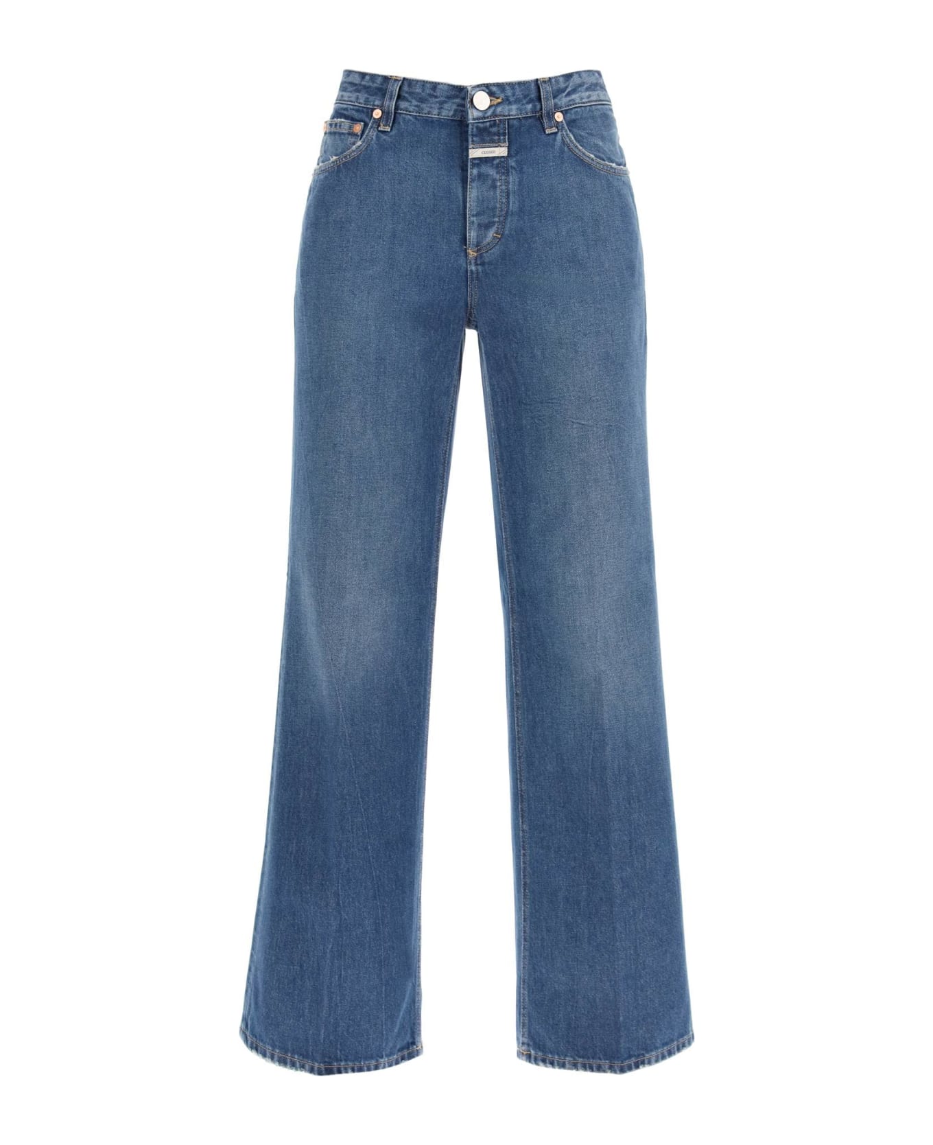Low-waisted Closed jeans made of eco-denim with a medium wash and a slim fit with flared leg. They feature a classic five-pocket construction complete with belt loops and a leather jacron on the back. The front closure with buttons is signed with a logo label on the flap. The model is 177 cm tall and wears a size 26.