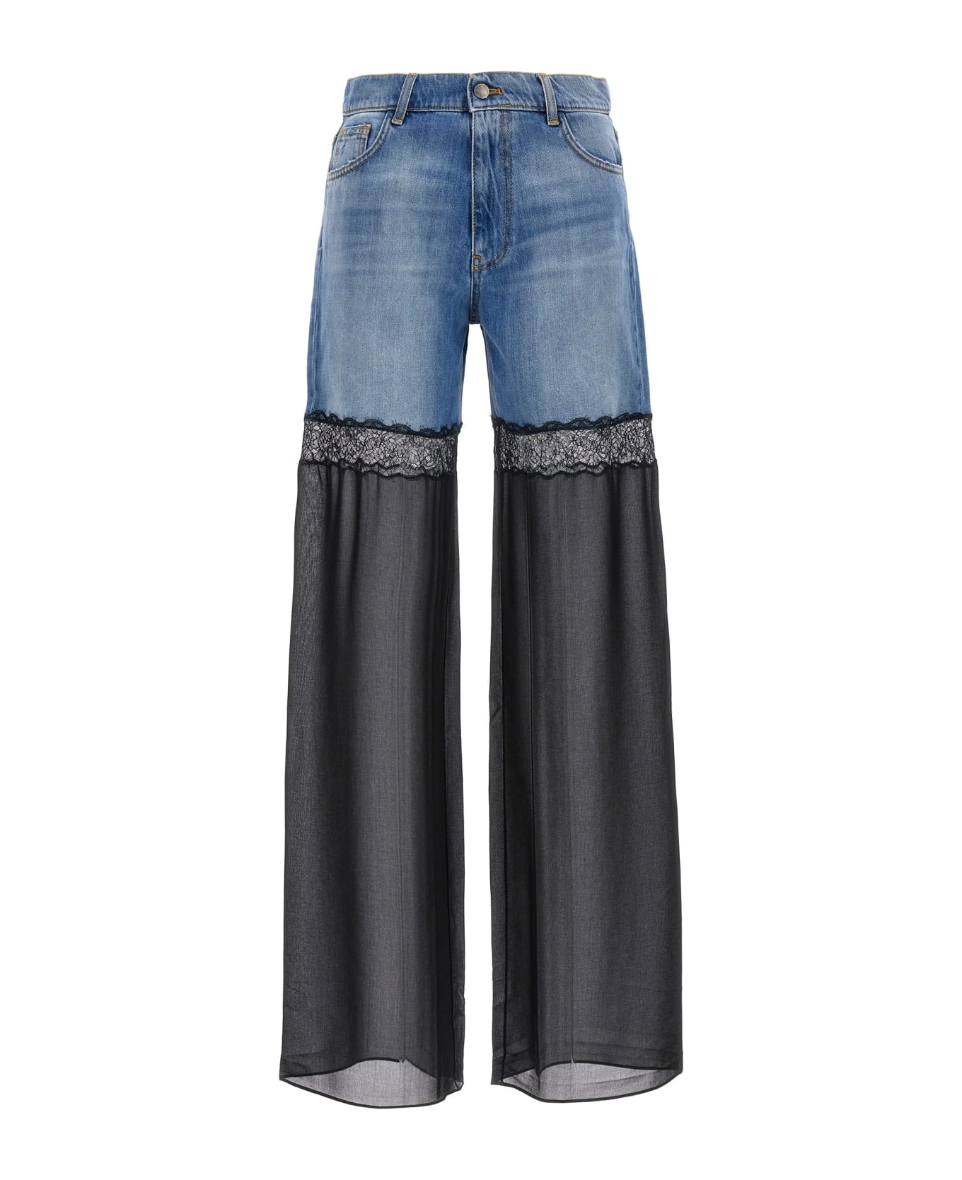 'Hybrid' cotton denim jeans with lace and crepe insert, zip and button closure, five pockets.