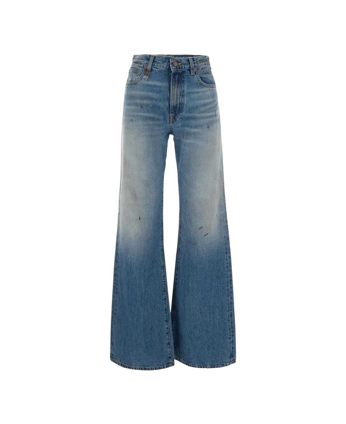 R13 Jane jeans in turner blue denim cotton with wide-leg and distressed details. The design is completed by belt loops, five-pockets design, an unfinished contrasting topstitching detail on the back pocket, zip fly, button closure, raw hems and letaher logo patch at back waistband.